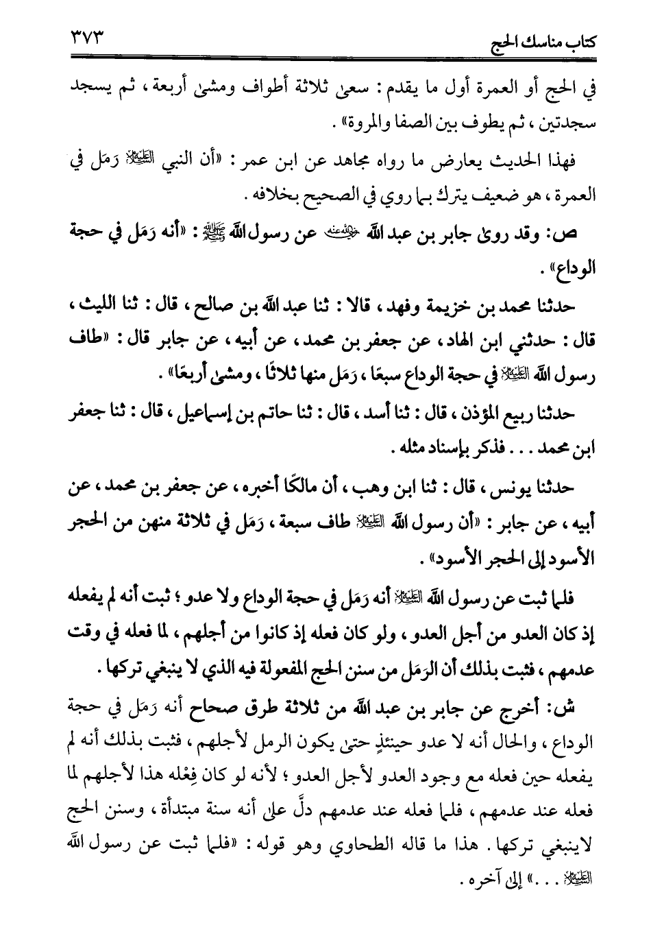 حدثنا محمد بن خزيمة وفهد، قالا: ثنا عبد الله بن صالح، قال: ثنا الليث، قال: حدثني ابن الهاد، عن جعفر بن محمد، عن أبيه، عن جابر قال: "طاف رسول الله -عليه السلام- في حجة الوداع سبعًا، رَمَل منها ثلاثاً، ومشى أربعًا".