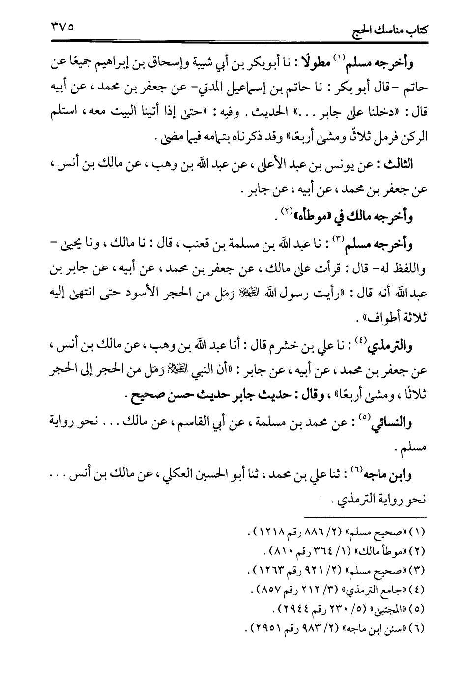 والترمذي (¬4): نا علي بن خشرم قال: أنا عبد الله بن وهب، عن مالك بن أنس، عن جعفر بن محمد، عن أبيه، عن جابر: "أن النبي -عليه السلام- رَمَل من الحجر إلى الحجر ثلاثاً، ومشى أربعًا"، وقال: حديث جابر حديث حسن صحيح.