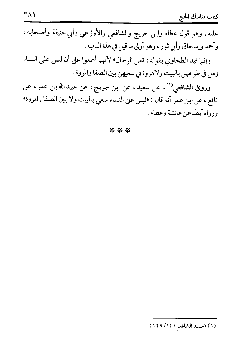 وروى الشافعي (¬1)، عن سعيد، عن ابن جريج، عن عبيد اللَّه بن عمر، عن نافع، عن ابن عمر أنه قال: "ليس على النساء سعي بالبيت ولا بين الصفا والمروة" ورواه أيضًا عن عائشة وعطاء.