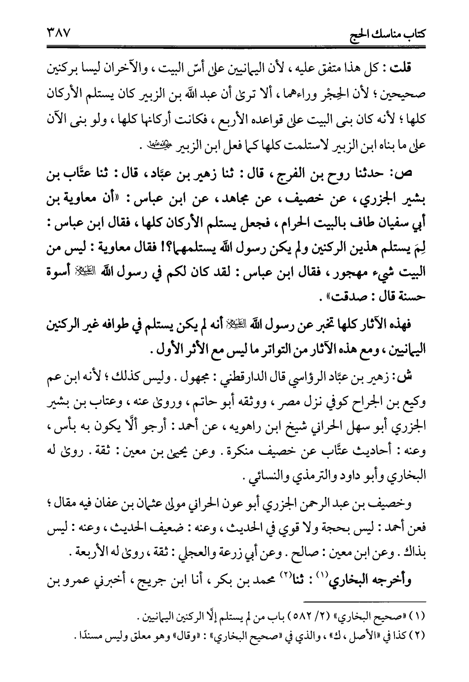 ص: حدثنا روح بن الفرج، قال: ثنا زهير بن عبَّاد، قال: ثنا عتَّاب بن بشير الجزري، عن خصيف، عن مجاهد، عن ابن عباس: "أن معاوية بن أبي سفيان طاف بالبيت الحرام، فجعل يستلم الأركان كلها، فقال ابن عباس: لِمَ يستلم هذين الركنين ولم يكن رسول اللَّه يستلمهما؟! فقال معاوية: ليس من البيت شيء مهجور، فقال ابن عباس: لقد كان لكم في رسول اللَّه -عليه السلام- أسوة حسنة قال: صدقت".