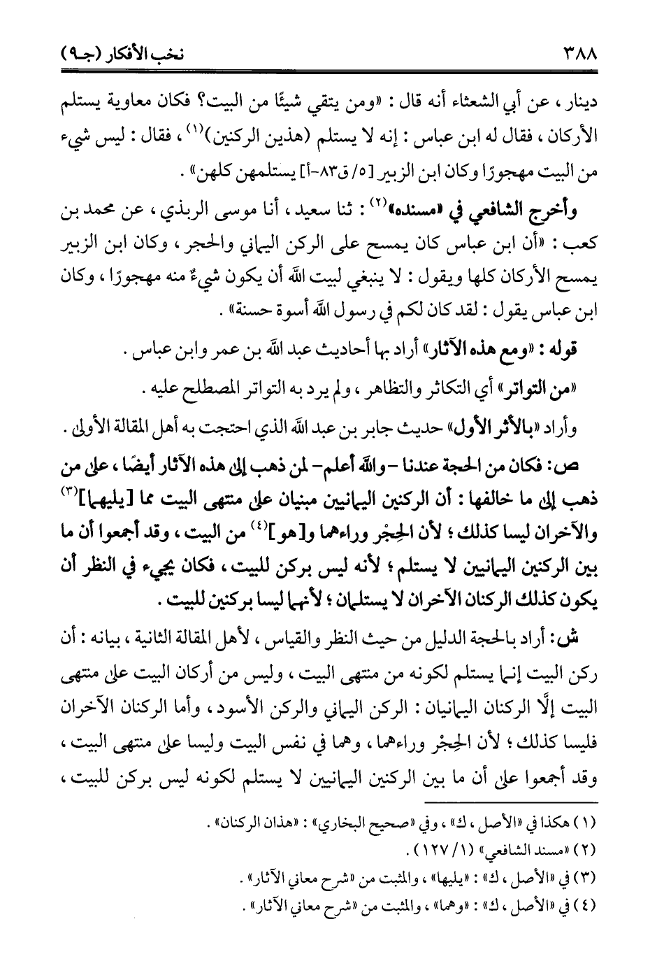 ص: فكان من الحجة عندنا -والله أعلم- لمن ذهب إلى هذه الآثار أيضًا، على من ذهب إلى ما خالفها: أن الركنين اليمانيين مبنيان على منتهى البيت مما [يليهما] (¬3) والآخران ليسا كذلك؛ لأن الحِجْر وراءهما و [هو] (¬4) من البيت، وقد أجمعوا أن ما بين الركنين اليمانيين لا يستلم؛ لأنه ليس بركن للبيت، فكان يجيء في النظر أن يكون كذلك الركنان الآخران لا يستلمان؛ لأنهما ليسا بركنين للبيت.
