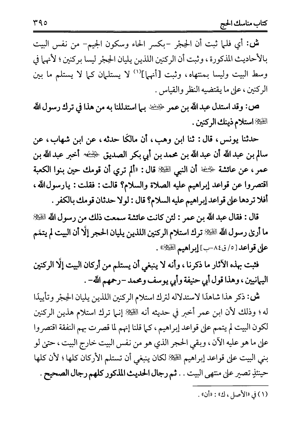 ش: أي فلما ثبت أن الحِجْر -بكسر الحاء وسكون الجيم- من نفس البيت بالأحاديث المذكورة، وثبت أن الركنين اللذين يليان الحِجْر ليسا بركنين؛ لأنهما في وسط البيت وليسا بمنتهاه، وثبت [أنهما] (¬1) "يستلمان كما لا يستلم ما بين الركنين، على ما يقتضيه النظر والقياس.