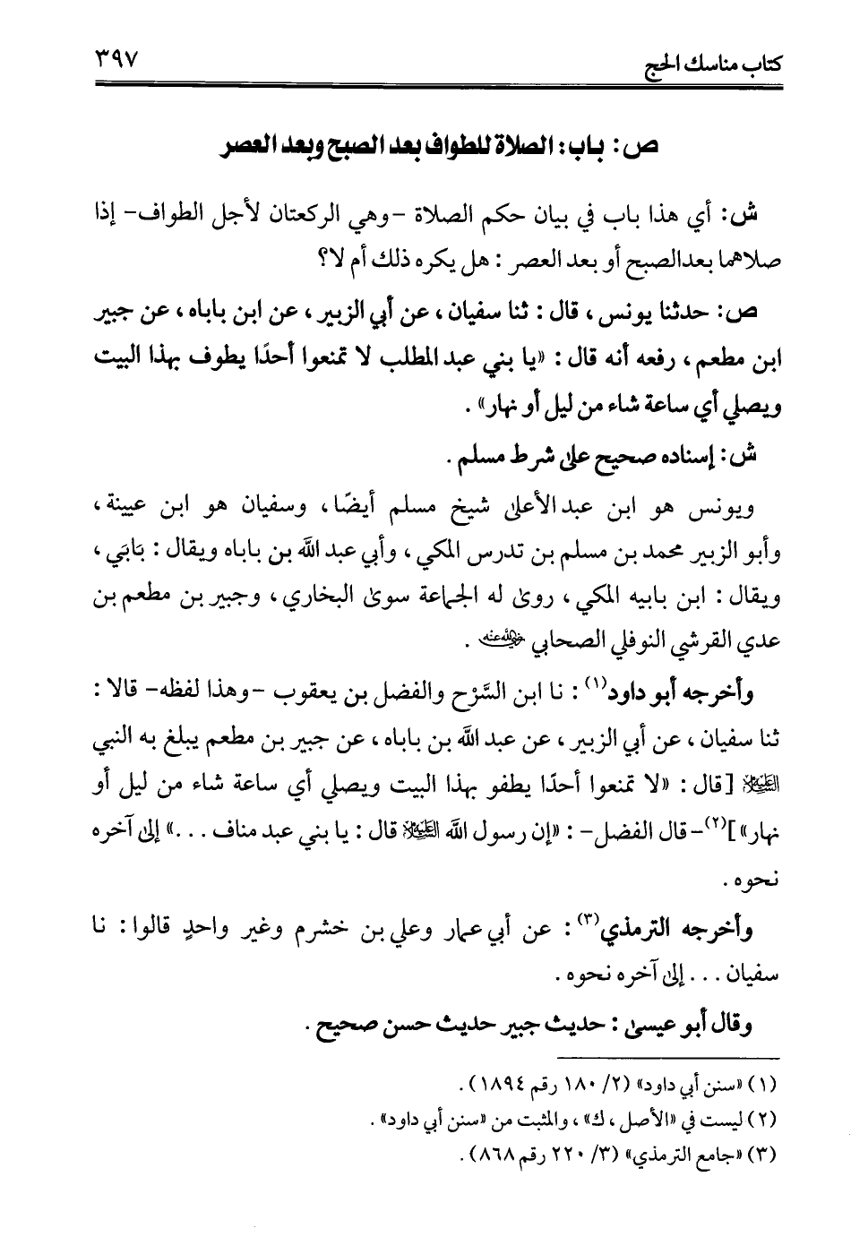 وأخرجه أبو داود (¬1): نا ابن السَّرْح والفضل بن يعقوب -وهذا لفظه- قالا: ثنا سفيان، عن أبي الزبير، عن عبد اللَّه بن باباه، عن جبير بن مطعم يبلغ به النبي -عليه السلام-[قال: "لا تمنعوا أحدًا يطفو بهذا البيت ويصلي أي ساعة شاء من ليل أو نهار"] (¬2) -قال الفضل-: "إن رسول اللَّه -عليه السلام- قال: يا بني عبد مناف ... " إلى آخره نحوه.