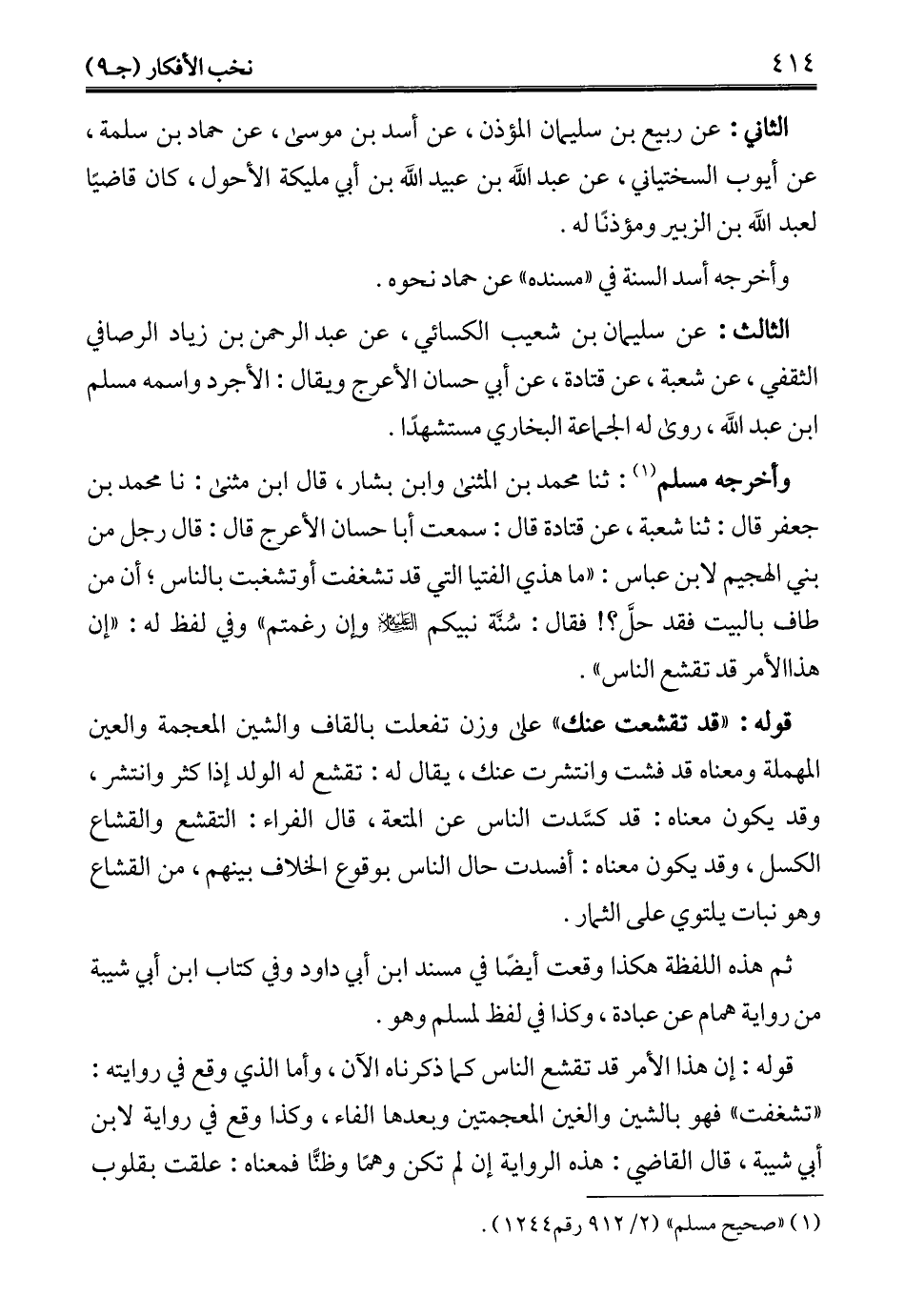 وأخرجه مسلم (¬1): ثنا محمد بن المثنى وابن بشار، قال ابن مثنى: نا محمد بن جعفر قال: ثنا شعبة، عن قتادة قال: سمعت أبا حسان الأعرج قال: قال رجل من بني الهجيم لابن عباس: "ما هذي الفتيا التي قد تشغفت أو تشغبت بالناس؛ أن من طاف بالبيت فقد حلَّ؟! فقال: سُنَّة نبيكم -عليه السلام- وإن رغمتم" وفي لفظ له: "إن هذا الأمر قد تقشع الناس".