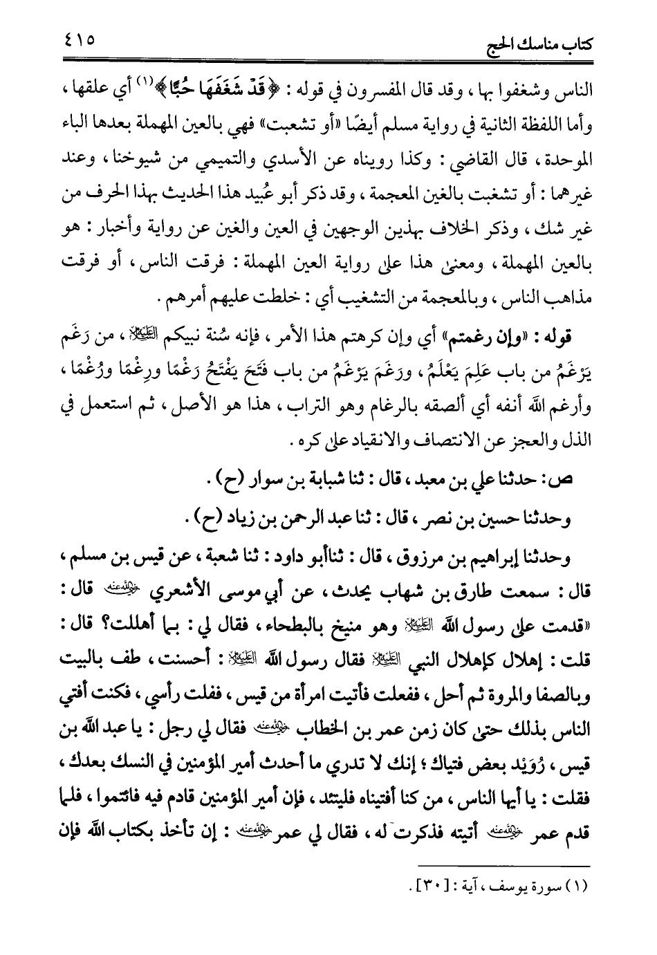 وحدثنا إبراهيم بن مرزوق، قال: ثنا أبو داود: ثنا شعبة، عن قيس بن مسلم، قال: سمعت طارق بن شهاب يحدث، عن أبي موسى الأشعري -رضي الله عنه- قال: "قدمت على رسول الله -عليه السلام- وهو منيخ بالبطحاء، فقال لي: بما أهللت؟ قال: قلت: إهلال كإهلال النبي -عليه السلام- فقال رسول الله -عليه السلام-: أحسنت، طف بالبيت وبالصفا والمروة ثم أحل، ففعلت فأتيت امرأة من قيس، فقلت رأسي، فكنت أفتي الناس بذلك حتى كان زمن عمر بن الخطاب -رضي الله عنه- فقال لي رجل: يا عبد الله بن قيس، رُوَيْد بعض فتياك؛ إنك لا تدري ما أحدث أمير المؤمنين في النسك بعدك، فقلت: يا أيها الناس، من كنا أفتيناه فليتئد، فإن أمير المؤمنين قادم فيه فائتموا، فلما قدم عمر -رضي الله عنه- أتيته فذكرت له، فقال لي عمر -رضي الله عنه-: إن تأخذ بكتاب الله فإن