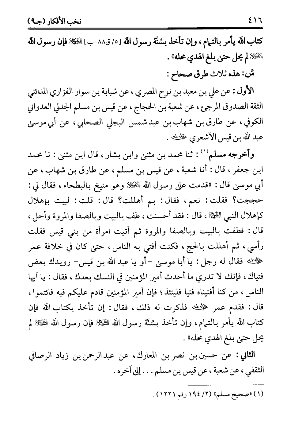 وأخرجه مسلم (¬1): ثنا محمد بن مثنى وابن بشار، قال ابن مثنى: نا محمد ابن جعفر، قال: أنا شعبة، عن قيس بن مسلم، عن طارق بن شهاب، عن أبي موسى قال: "قدمت على رسول الله -عليه السلام- وهو منيخ بالبطحاء، فقال لي: حججت؟ فقلت: نعم، فقال: بم أهللت؟ قال: قلت: لبيت بإهلال كإهلال النبي -عليه السلام-، قال: فقد أحسنت، طف بالبيت وبالصفا والمروة وأحل، قال: فطفت بالبيت وبالصفا والمروة ثم أتيت امرأة من بني قيس ففلت رأسي، ثم أهللت بالحج، فكنت أفتي به الناس، حتى كان في خلافة عمر -رضي الله عنه- فقال له رجل: يا أبا موسى -أو يا عبد الله بن قيس- رويدك بعض فتياك، فإنك لا تدري ما أحدث أمير المؤمنين في النسك بعدك، فقال: يا أيها الناس، من كنا أفتيناه فتيا فليتئذ؛ فإن أمير المؤمنين قادم عليكم فيه فائتموا، قال: فقدم عمر -رضي الله عنه- فذكرت له ذلك، فقال: إن تأخذ بكتاب الله فإن كتاب الله يأمر بالتمام، وإن تأخذ بسُنَّة رسول الله -عليه السلام- فإن رسول الله -عليه السلام- لم يحل حتى بلغ الهدي محله".