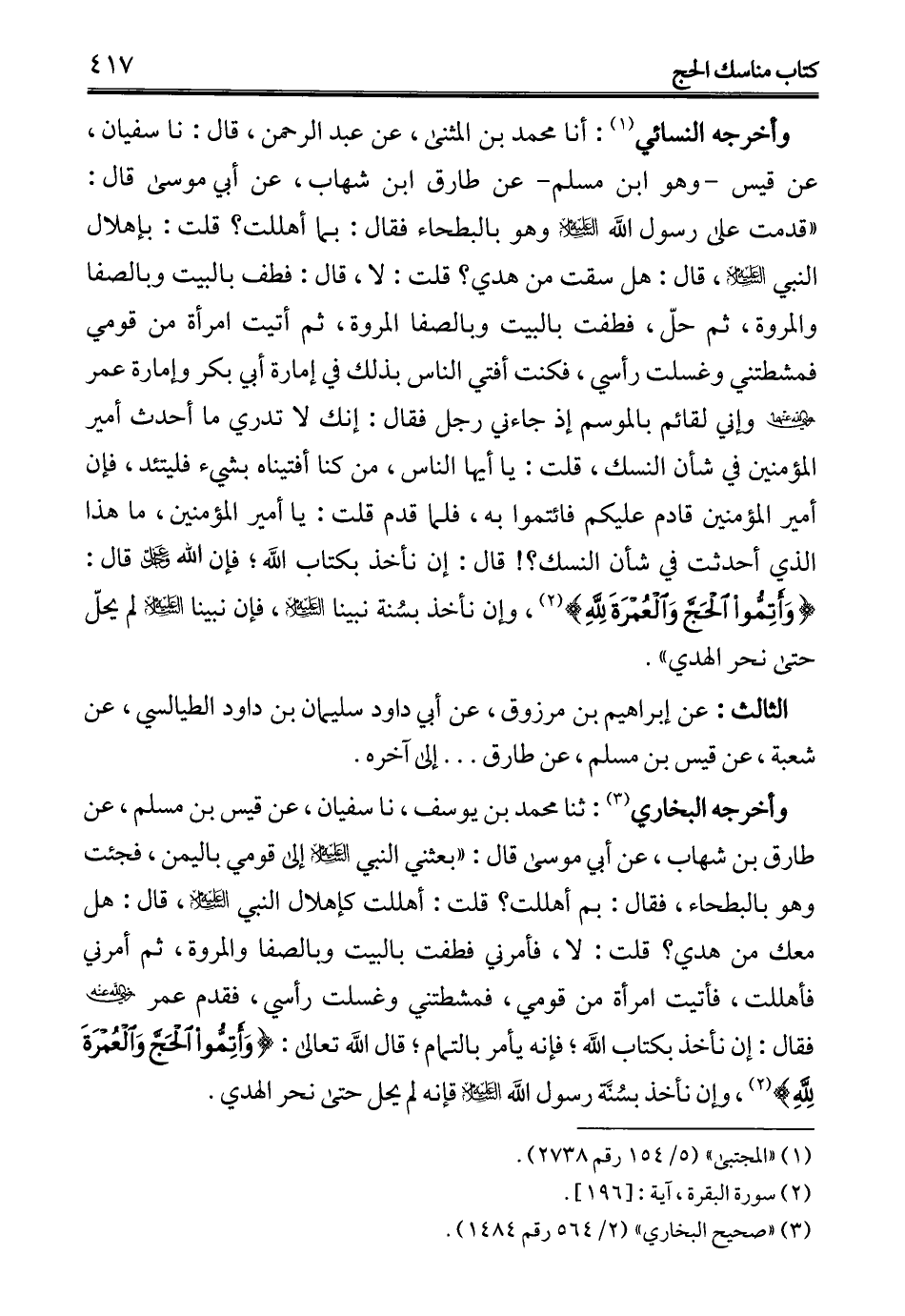وأخرجه النسائي (¬1): أنا محمد بن المثنى، عن عبد الرحمن، قال: نا سفيان، عن قيس -وهو ابن مسلم- عن طارق ابن شهاب، عن أبي موسى قال: "قدمت على رسول الله -عليه السلام- وهو بالبطحاء فقال: بما أهللت؟ قلت: بإهلال النبي -عليه السلام-، قال: هل سقت من هدي؟ قلت: لا، قال: فطف بالبيت وبالصفا والمروة، ثم حلّ، فطفت بالبيت وبالصفا والمروة، ثم أتيت امرأة من قومي فمشطتني وغسلت رأسي، فكنت أفتي الناس بذلك في إمارة أبي بكر وإمارة عمر -رضي الله عنهما- وإني لقائم بالموسم إذ جاءني رجل فقال: إنك لا تدري ما أحدث أمير المؤمنين في شأن النسك، قلت: يا أيها الناس، من كنا أفتيناه بشيء فليتئد، فإن أمير المؤمنين قادم عليكم فائتموا به، فلما قدم قلت: يا أمير المؤمنين، ما هذا الذي أحدثت في شأن النسك؟! قال: إن نأخذ بكتاب الله؛ فإن الله -عز وجل- قال: {وَأَتِمُّوا الْحَجَّ وَالْعُمْرَةَ لِلَّهِ} (¬2)، وإن نأخذ بسُنة نبينا -عليه السلام-، فإن نبينا -عليه السلام- لم يحلّ حتى نحر الهدي".