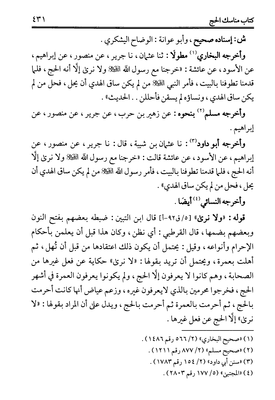 وأخرجه أبو داود (¬3): نا عثمان بن شيبة، قال: نا جرير، عن منصور، عن إبراهيم، عن الأسود، عن عائشة قالت: "خرجنا مع رسول الله -عليه السلام- ولا نرى إلَّا أنه الحج، فلما قدمنا تطوفنا بالبيت، فأمر رسول الله -عليه السلام- من لم يكن ساق الهدي أن يحل، فحل من لم يكن ساق الهدي".