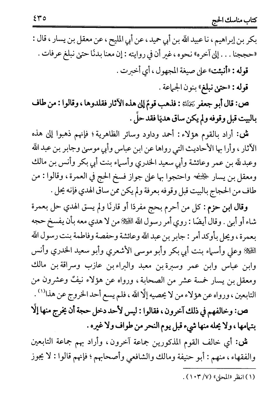 ش: أراد بالقوم هؤلاء: أحمد وداود وسائر الظاهرية؛ فإنهم ذهبوا إلى هذه الآثار، وأرا بها الأحاديث التي رواها عن ابن عباس وأبي موسى وجابر بن عبد الله وعبد لله بن عمر وعائشة وأبي سعيد الخدري وأسماء بنت أبي بكر وأنس بن مالك ومعقل بن يسار -رضي الله عنهم- واحتجوا بها على جواز فسخ الحج في العمرة، وقالوا: من طاف من الحجاج بالبيت قبل وقوفه بعرفة ولم يكن ممن ساق الهدي فإنه يحل.