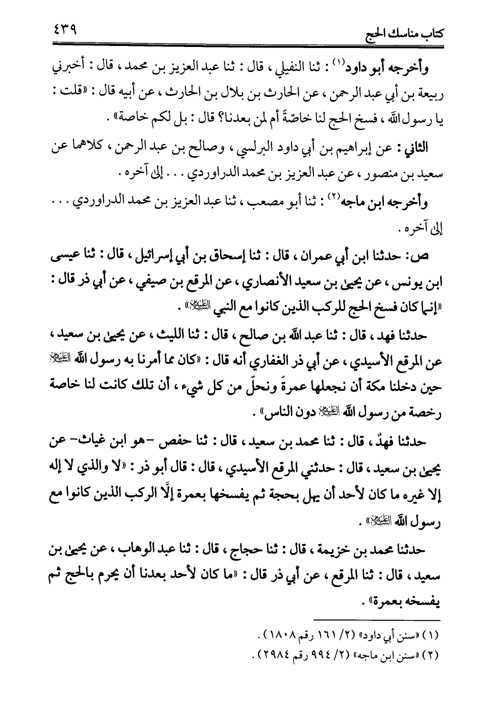 وأخرجه أبو داود (¬1): ثنا النفيلي، قال: ثنا عبد العزيز بن محمد، قال: أخبرني ربيعة بن أبي عبد الرحمن، عن الحارث بن بلال بن الحارث، عن أبيه قال: "قلت: يا رسول الله، فسخ الحج لنا خاصّةً أم لمن بعدنا؟ قال: بل لكم خاصة".