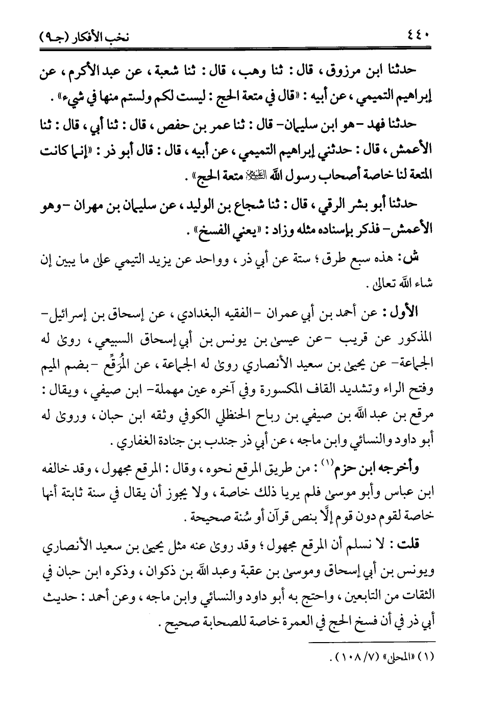 حدثنا فهد -هو ابن سليمان- قال: ثنا عمر بن حفص، قال: ثنا أبي، قال: ثنا الأعمش، قال: حدثني إبراهيم التميمي، عن أبيه، قال: قال أبو ذر: "إنما كانت المتعة لنا خاصة أصحاب رسول الله -عليه السلام- متعة الحج".