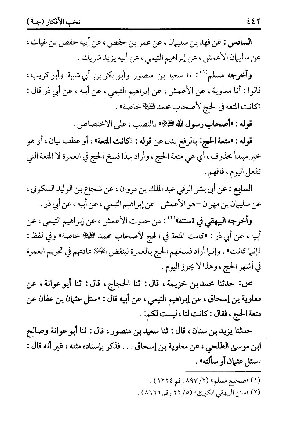 وأخرجه مسلم (¬1): نا سعيد بن منصور وأبو بكر بن أبي شيبة وأبو كريب، قالوا: أنا معاوية، عن الأعمش، عن إبراهيم التيمي، عن أبيه، عن أبي ذر قال: "كانت المتعة في الحج لأصحاب محمد -عليه السلام- خاصة".