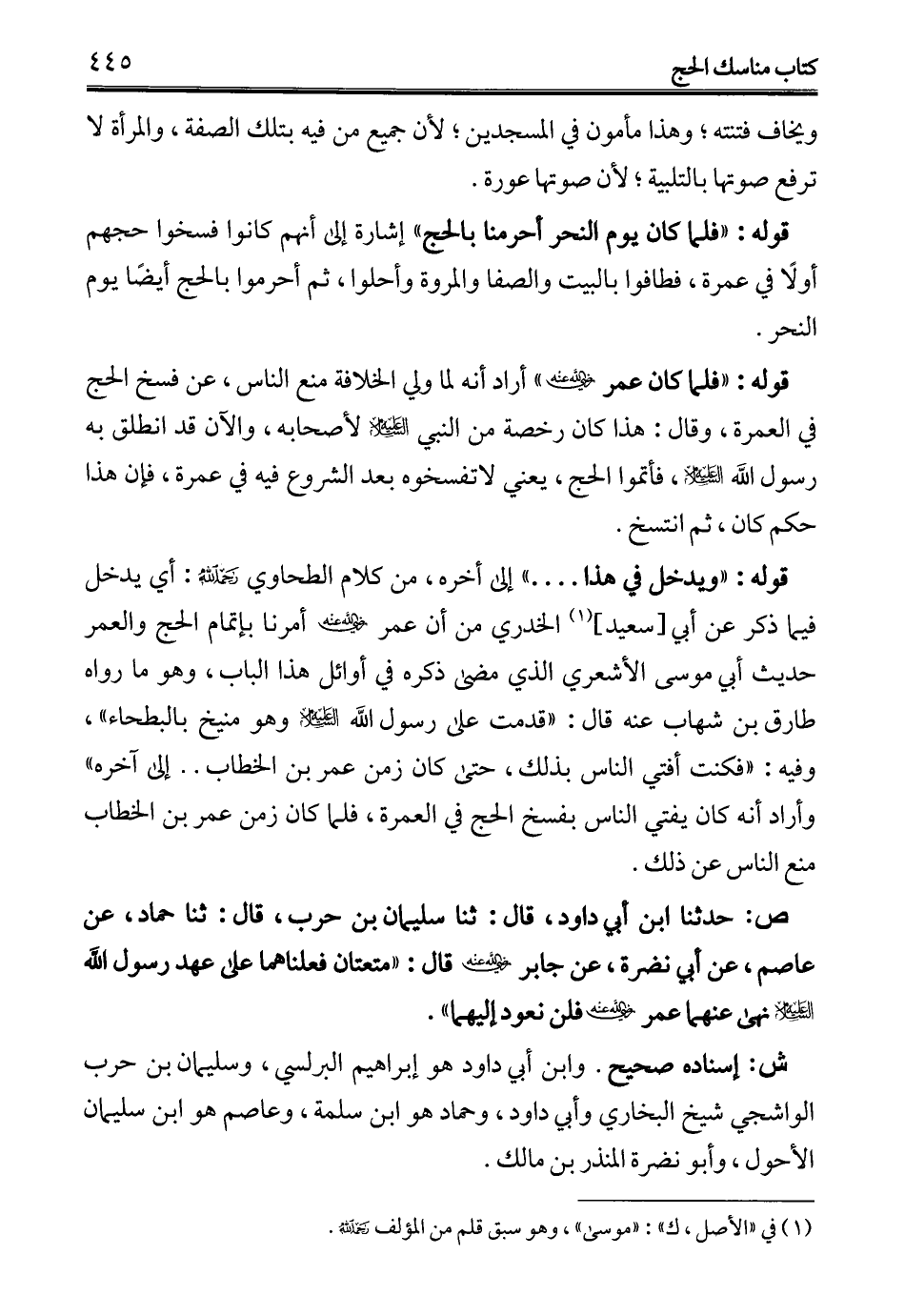 ص: حدثنا ابن أبي داود، قال: ثنا سليمان بن حرب، قال: ثنا حماد، عن عاصم، عن أبي نضرة، عن جابر -رضي الله عنه- قال: "متعتان فعلناهما على عهد رسول الله -عليه السلام- نهى عنهما عمر -رضي الله عنه- فلن نعود إليهما".