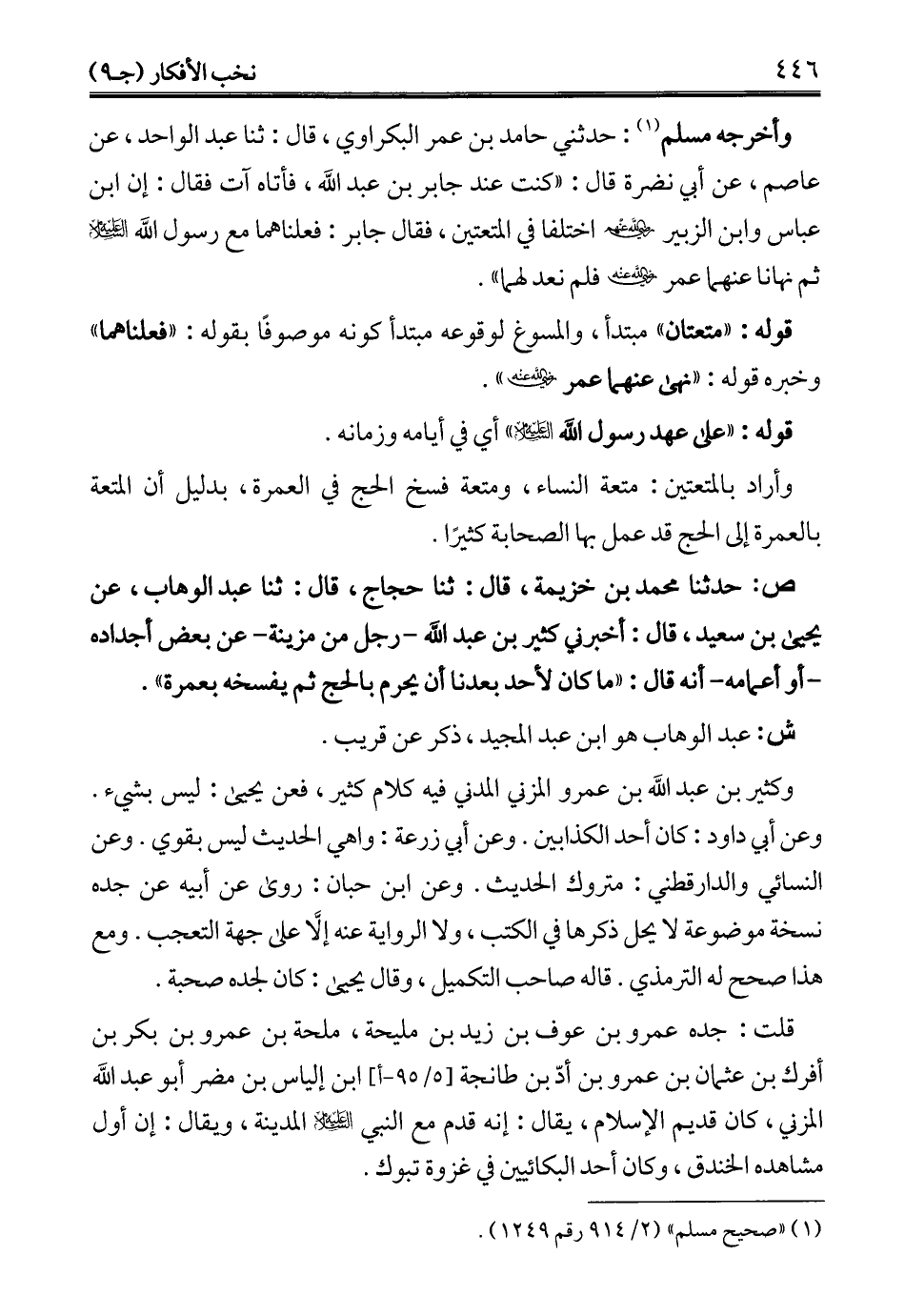 وأخرجه مسلم (¬1): حدثني حامد بن عمر البكراوي، قال: ثنا عبد الواحد، عن عاصم، عن أبي نضرة قال: "كنت عند جابر بن عبد الله، فأتاه آت فقال: إن ابن عباس وابن الزبير -رضي الله عنهم- اختلفا في المتعتين، فقال جابر: فعلناهما مع رسول الله -عليه السلام- ثم نهانا عنهما عمر -رضي الله عنه- فلم نعدلهما".