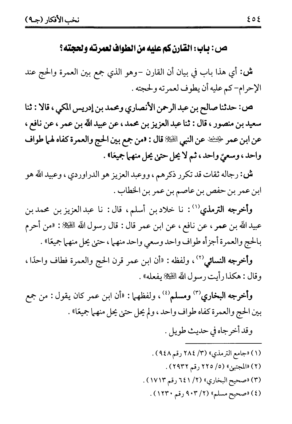 ص: حدثنا صالح بن عبد الرحمن الأنصاري ومحمد بن إدريس المكي، قالا: ثنا سعيد بن منصور، قال: ثنا عبد العزيز بن محمد، عن عبيد الله بن عمر، عن نافع، عن ابن عمر -رضي الله عنهما- عن النبي -عليه السلام- قال: "من جمع بين الحج والعمرة كفاه لهما طواف واحد، وسعيٌ واحد، ثم لا يحل حتى يحل منهما جميعًا".