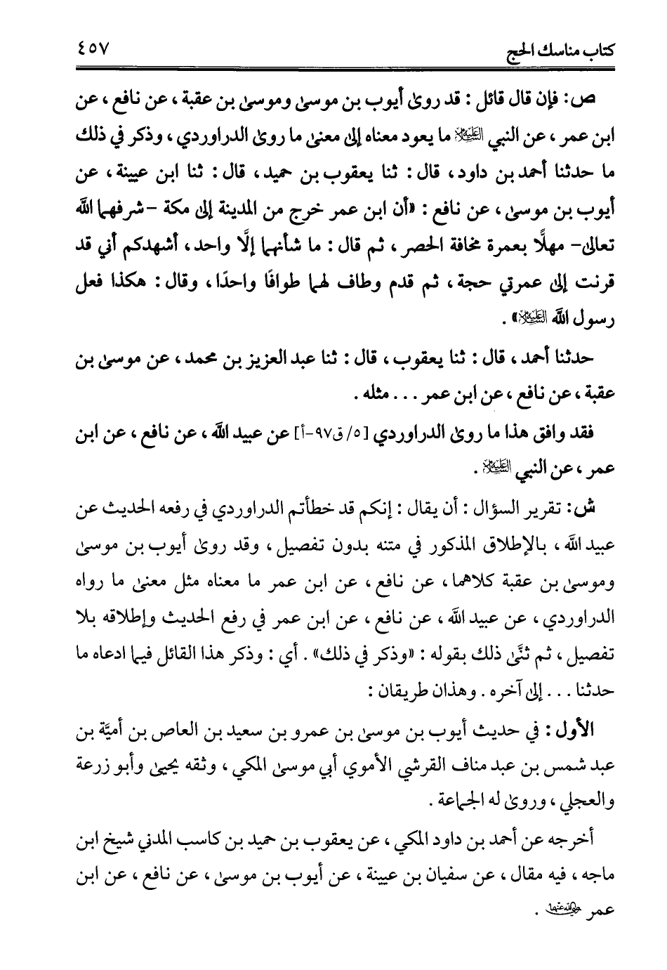 ش: تقرير السؤال: أن يقال: إنكم قد خطأتم الدراوردي في رفعه الحديث عن عبيد الله، بالإِطلاق المذكور في متنه بدون تفصيل، وقد روى أيوب بن موسى وموسى بن عقبة كلاهما، عن نافع، عن ابن عمر ما معناه مثل معنى ما رواه الدراوردي، عن عبيد الله، عن نافع، عن ابن عمر في رفع الحديث وإطلاقه بلا تفصيل، ثم ثنَّى ذلك بقوله: "وذكر في ذلك". أي: وذكر هذا القائل فيما ادعاه ما حدثنا ... إلى آخره. وهذان طريقان:
