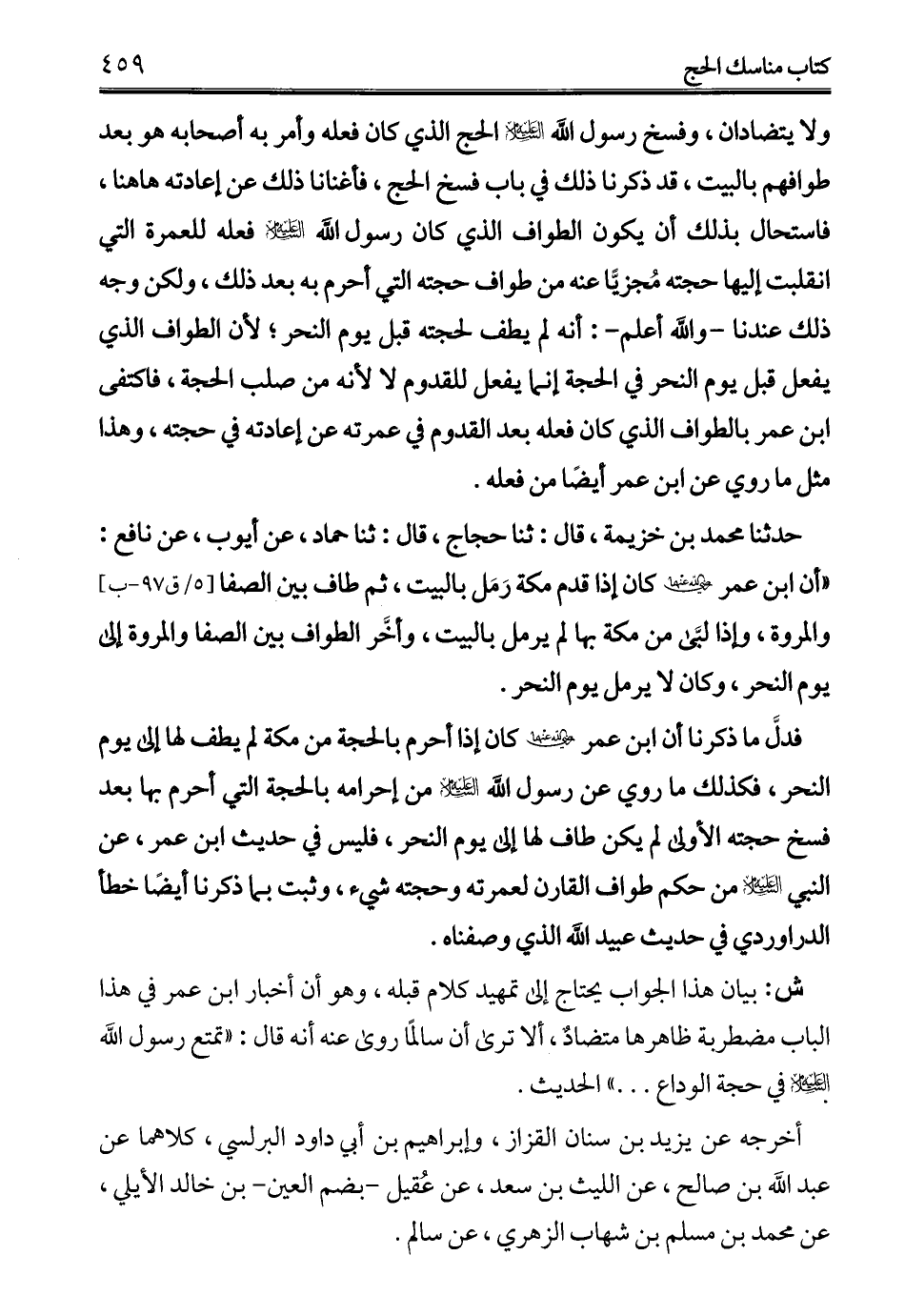 فدلَّ ما ذكرنا أن ابن عمر -رضي الله عنهما- كان إذا أحرم بالحجة من مكة لم يطف لها إلى يوم النحر، فكدلك ما روي عن رسول الله -عليه السلام- من إحرامه بالحجة التي أحرم بها بعد فسخ حجته الأولى لم يكن طاف لها بك يوم النحر، فليس في حديث ابن عمر، عن النبي -عليه السلام- من حكم طواف القارن لعمرته وحجته شيء، وثبت بما ذكرنا أيضًا خطأ الدراوردي في حديث عبيد الله الذي وصفناه.