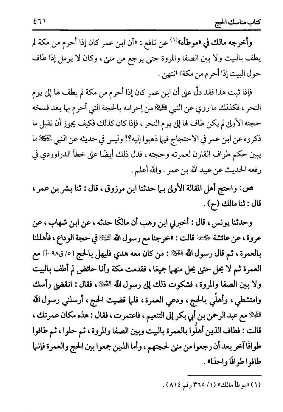 فإذا ثبت هذا فقد دلّ على أن ابن عمر كان إذا أحرم من مكة لم يطف لها إلى يوم النحر، فكذلك ما روي عن النبي -عليه السلام- من إحرامه بالحجة التي أحرم بها بعد فسخه حجته الأولى لم يكن طاف لها إلى يوم النحر، فإذا كان كذلك فكيف يجوز أن نقبل ما ذكروه عن ابن عمر في الاحتجاج فيما ذهبوا إليه؟! وليس في حديثه عن النبي -عليه السلام- ما يبين حكم طواف القارن لعمرته وحجته، فدل ذلك أيضًا على خطأ الدراوردي في رفعه الحديث عن عبيد الله بن عمر. والله أعلم.