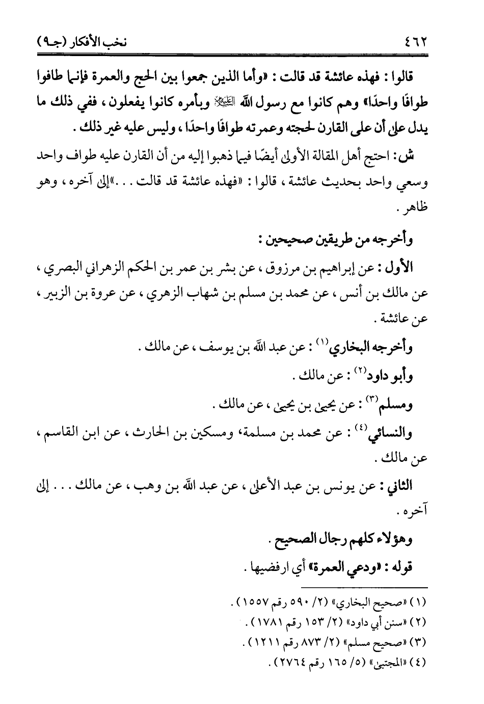ش: احتج أهل المقالة الأولى أيضًا فيما ذهبوا إليه من أن القارن عليه طواف واحد وسعي واحد بحديث عائشة، قالوا: "فهذه عائشة قد قالت ... " إلى آخره، وهو ظاهر.