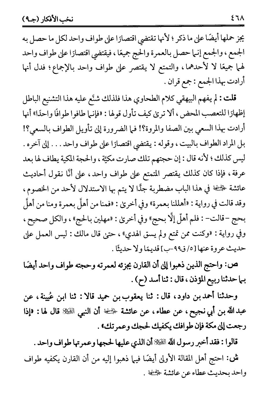 قلت: لم يفهم البيهقي كلام الطحاوي هذا فلذلك شنَّع عليه هذا التشنيع الباطل إظهارًا للتعصب المحض، ألا ترى كيف تأول قولها: "فإنما طافوا طوافًا واحدًا" أنها أرادت بهذا السعي بين الصفا والمروة؟! فما الضرورة إلى تأوبل الطواف بالسعي؟! بل المراد الطواف بالبيت، وقوله: يقتضي اقتصارًا على طواف واحد ... إلى آخره. ليس كذلك؛ لأنه قال: إن حجتهم تلك صارت مكيَّة، والحجة المكية يطاف لها بعد عرفة، فإذا كان كذلك يقتصر المتمتع على طواف واحد، على أنَّا نقول أحاديث عائشة -رضي الله عنها- في هذا الباب مضطربة جدًّا لا يتم بها الاستدلال لأحد من الخصوم، وقد قالت في رواية: "أهللنا بعمرة" وفي أخرى: "فمنا من أهلَّ بعمرهّ ومنا من أهلَّ بحج -قالت-: فلم أهلّ إلاَّ بحج" وفي أخرى: "مهلين بالحج"، والكل صحيح، وفي رواية: "وكنت ممن تمتع ولم يسق الهدي"، حتى قال مالك: ليس العمل على حديث عروة عنها قديمًا ولا حديثًا.
