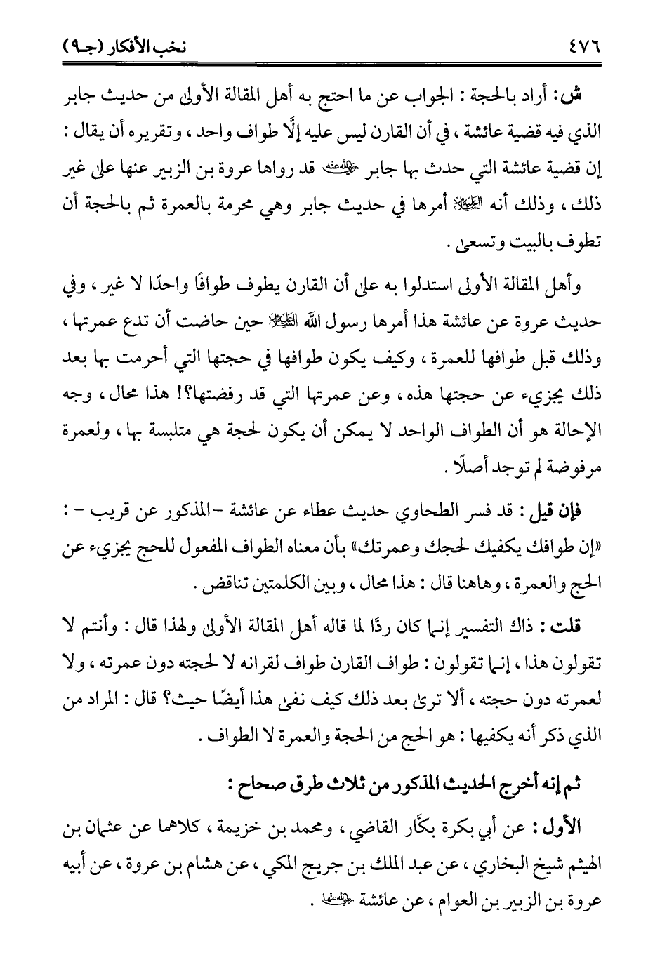 ش: أراد بالحجة: الجواب عن ما احتج به أهل المقالة الأولى من حديث جابر الذي فيه قضية عائشة، في أن القارن ليس عليه إلاَّ طواف واحد، وتقريره أن يقال: إن قضية عائشة التي حدث بها جابر -رضي الله عنه- قد رواها عروة بن الزبير عنها على غير ذلك، وذلك أنه -عليه السلام- أمرها في حديث جابر وهي محرمة بالعمرة ثم بالحجة أن تطوف بالبيت وتسعى.
