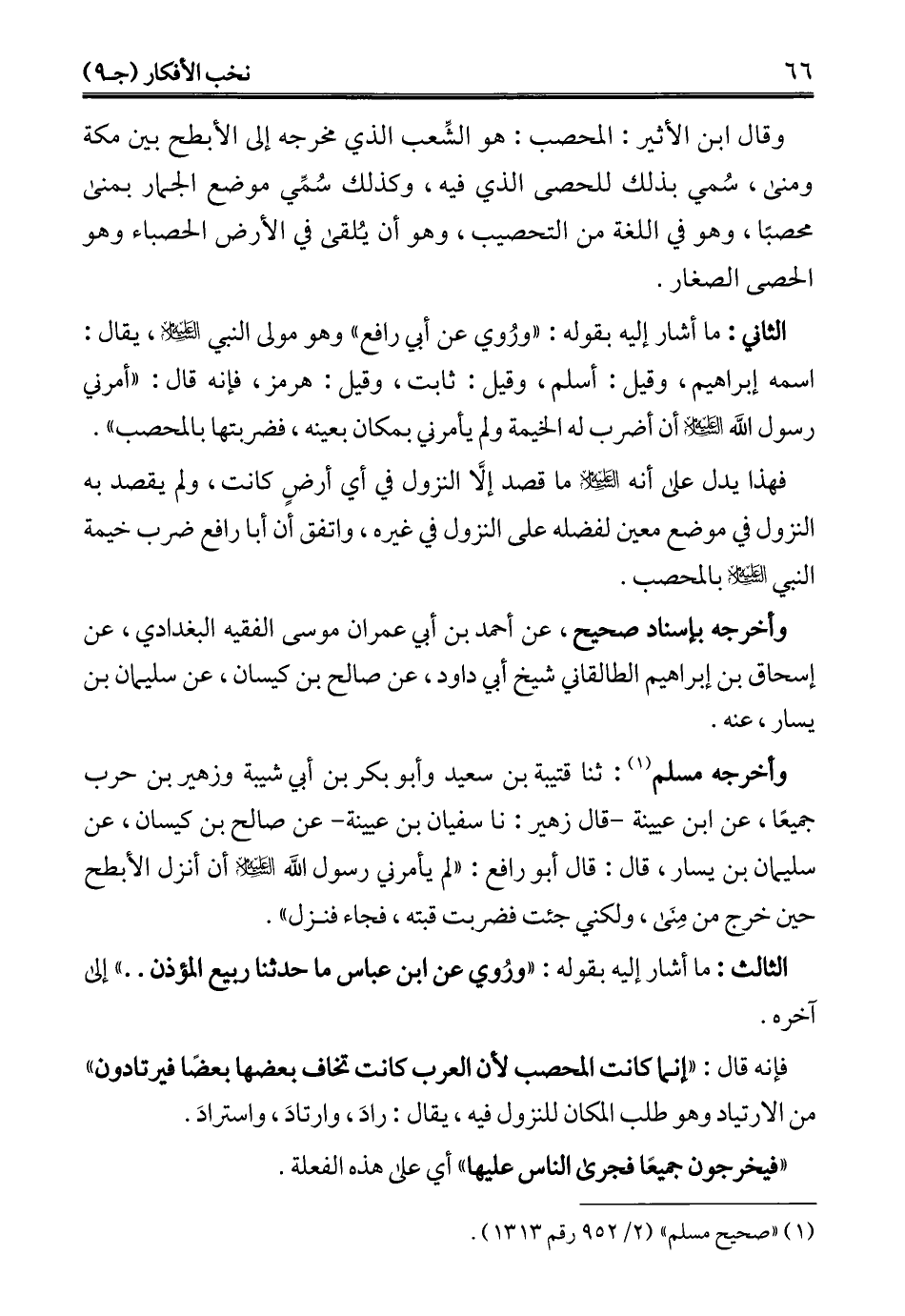 وأخرجه مسلم (¬1): ثنا قتيبة بن سعيد وأبو بكر بن أبي شيبة وزهير بن حرب جميعًا، عن ابن عيينة -قال زهير: نا سفيان بن عيينة- عن صالح بن كيسان، عن سليمان بن يسار، قال: قال أبو رافع: "لم يأمرني رسول الله -عليه السلام- أن أنزل الأبطح حين خرج من مِنَى، ولكني جئت فضربت قبته، فجاء فنزل".