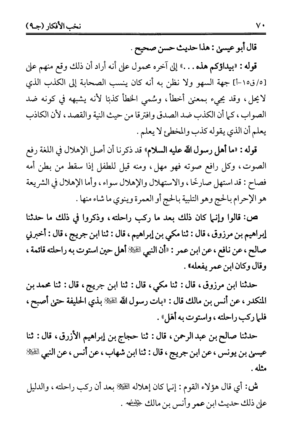 ش: أي قال هؤلاء القوم: إنما كان إهلاله -عليه السلام- بعد أن ركب راحلته، والدليل على ذلك حديث ابن عمر وأنس بن مالك -رضي الله عنهم-