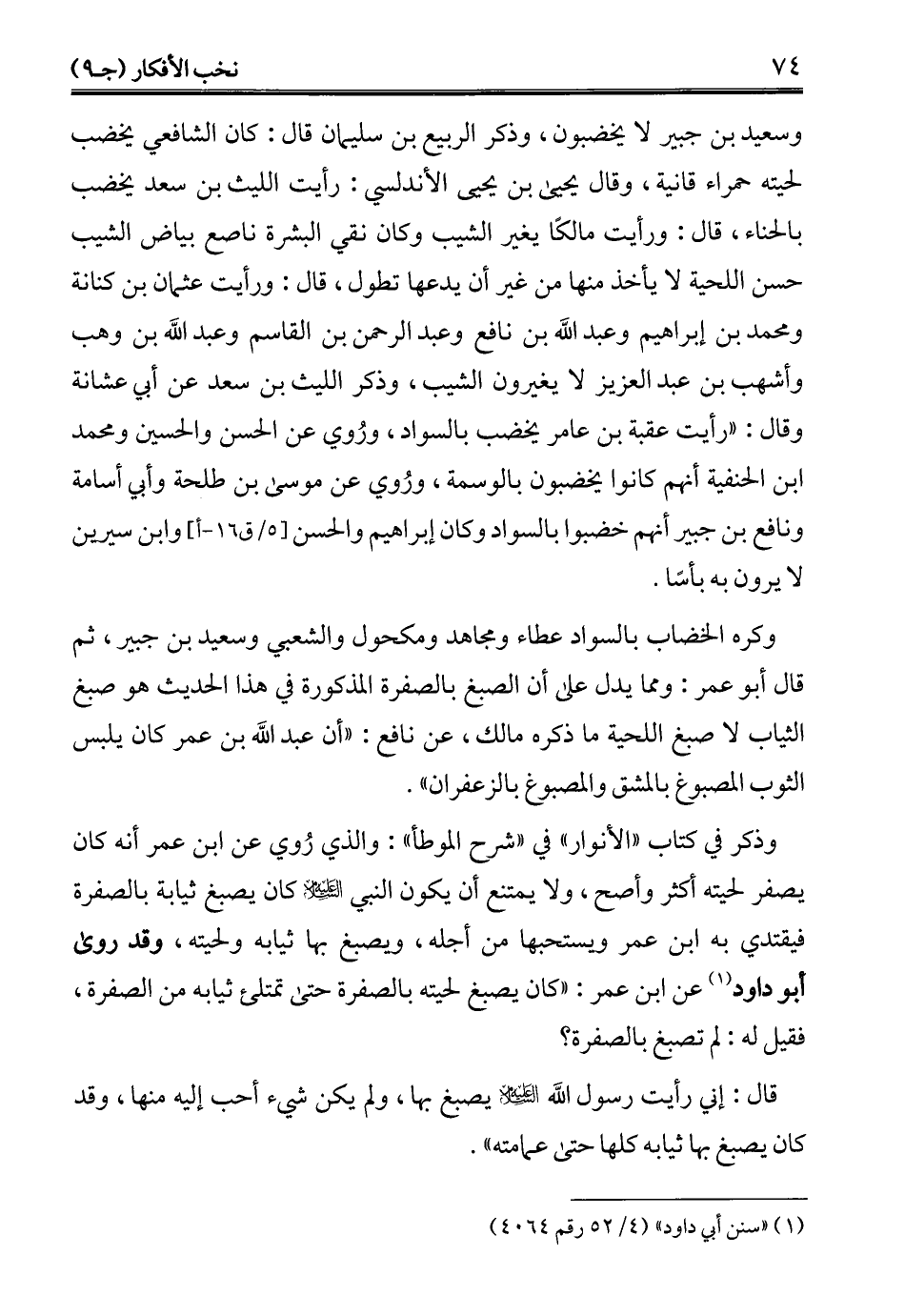 وسعيد بن جبير لا يخضبون، وذكر الربيع بن سليمان قال: كان الشافعي يخضب لحيته حمراء قانية، وقال يحيى بن يحيى الأندلسي: رأيت الليث بن سعد يخضب بالحناء، قال: ورأيت مالكًا يغير الشيب وكان نقي البشرة ناصع بياض الشيب حسن اللحية لا يأخذ منها من غير أن يدعها تطول، قال: ورأيت عثمان بن كنانة ومحمد بن إبراهيم وعبد الله بن نافع وعبد الرحمن بن القاسم وعبد الله بن وهب وأشهب بن عبد العزيز لا يغيرون الشيب، وذكر الليث بن سعد عن أبي عشانة وقال: "رأيت عقبة بن عامر يخضب بالسواد، ورُوي عن الحسن والحسن ومحمد ابن الحنفية أنهم كانوا يخضبون بالوسمة، ورُوي عن موسى بن طلحة وأبي أسامة ونافع بن جبير أنهم خضبوا بالسواد وكان إبراهيم والحسن وابن سيرين لا يرون به بأسًا.