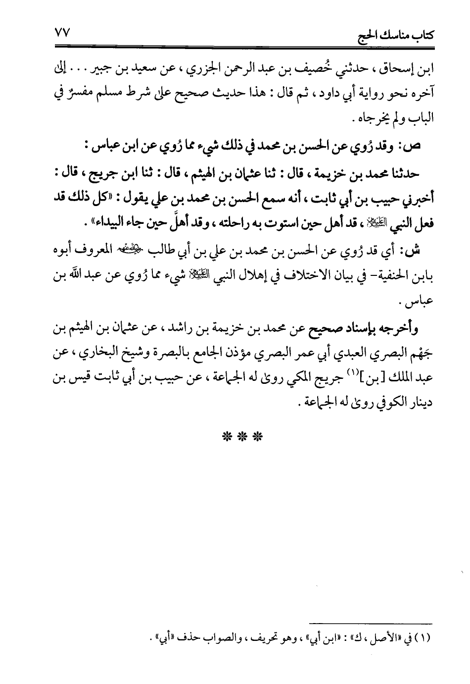 وأخرجه بإسناد صحيح عن محمد بن خزيمة بن راشد، عن عثمان بن الهيثم بن جَهْم البصري العبدي أبي عمر البصري مؤذن الجامع بالبصرة وشيخ البخاري، عن عبد الملك [بن] (¬1) جريج المكي روى له الجماعة، عن حبيب بن أبي ثابت قيس بن دينار الكوفي روى له الجماعة.
