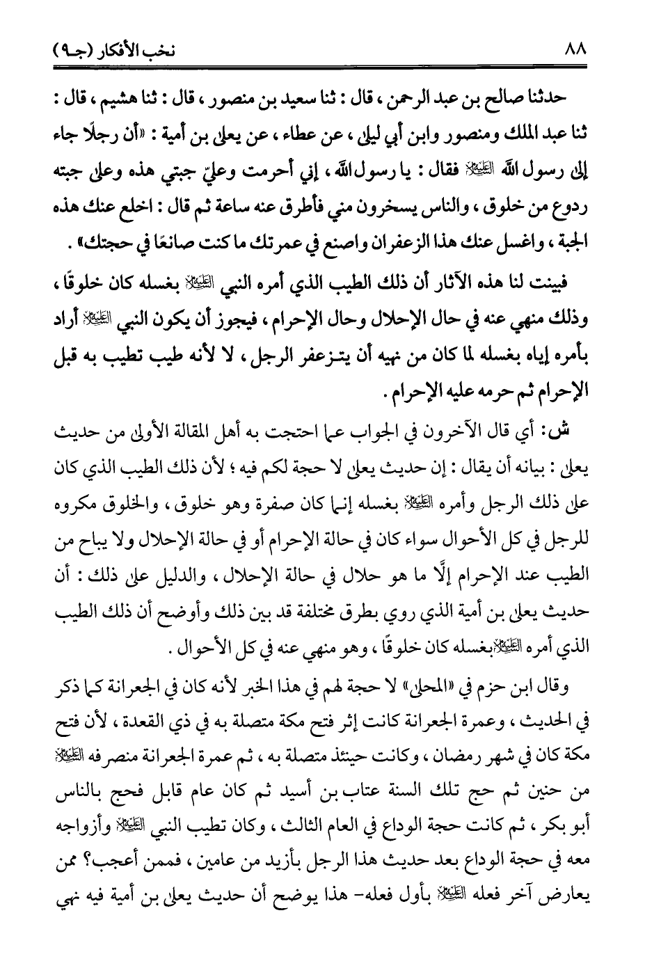 وقال ابن حزم في "المحلى" لا حجة لهم في هذا الخبر لأنه كان في الجعرانة كما ذكر في الحديث، وعمرة الجعرانة كانت إثر فتح مكة متصلة به في ذي القعدة، لأن فتح مكة كان في شهر رمضان، وكانت حينئذ متصلة به، ثم عمرة الجعرانة منصرفه -عليه السلام- من حنين ثم حج تلك السنة عتاب بن أسيد ثم كان عام قابل فحج بالناس أبو بكر، ثم كانت حجة الوداع في العام الثالث، وكان تطيب النبي -عليه السلام- وأزواجه معه في حجة الوداع بعد حديث هذا الرجل بأزيد من عامين، فممن أعجب؟ ممن يعارض آخر فعله -عليه السلام- بأول فعله -هذا يوضح أن حديث يعلى بن أمية فيه نهي