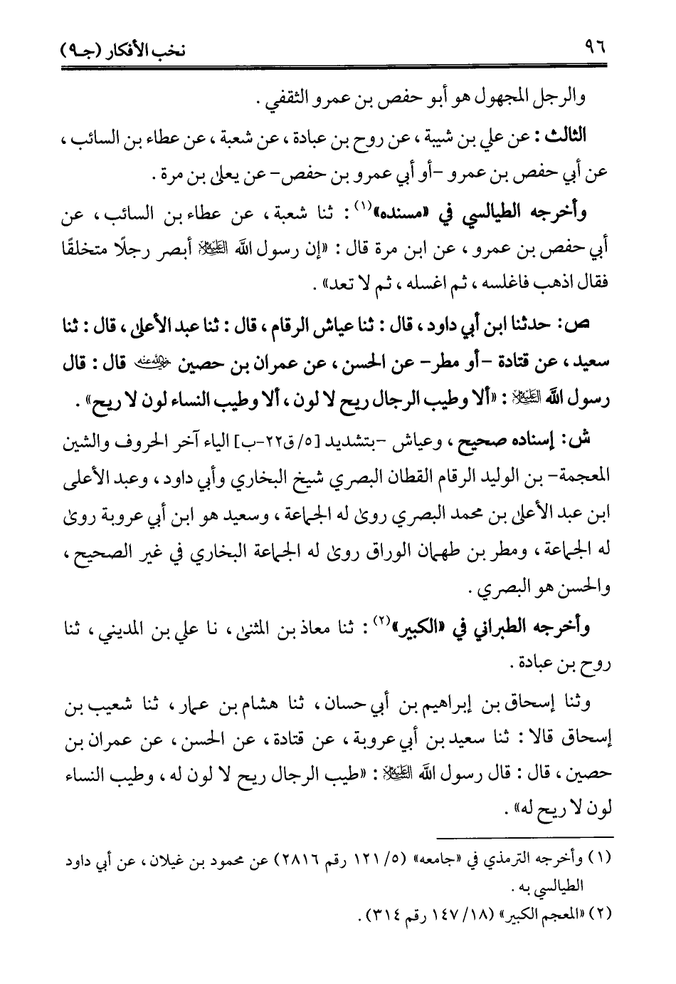 ص: حدثنا ابن أبي داود، قال: ثنا عياش الرقام، قال: ثنا عبد الأعلى، قال: ثنا سعيد، عن قتادة -أو مطر- عن الحسن، عن عمران بن حصين -رضي الله عنه- قال: قال رسول الله -عليه السلام-: "ألا وطيب الرجال ريح لا لون، ألا وطيب النساء لون لا ريح".