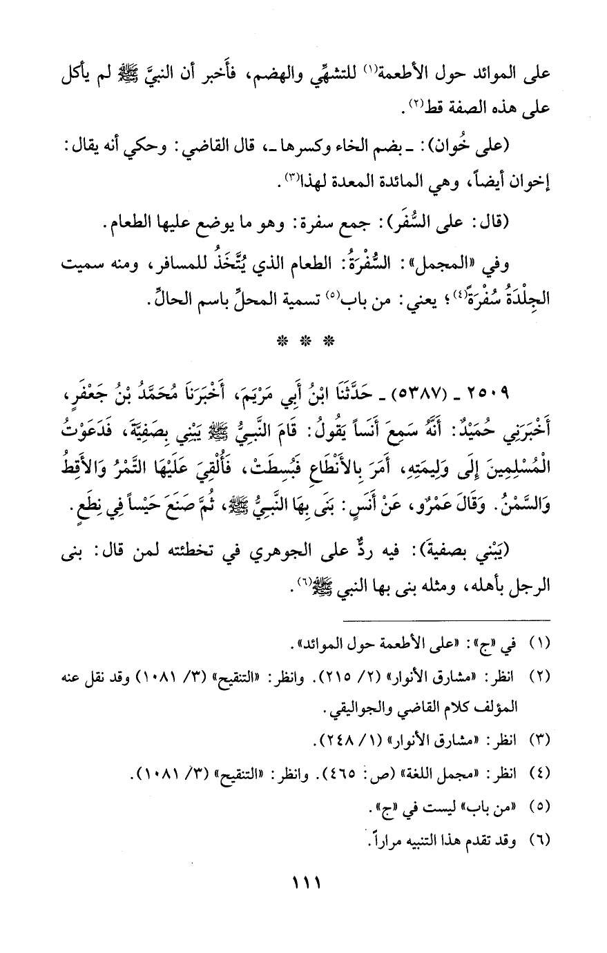 2509 - (5387) - حَدَّثَنَا ابْنُ أَبي مَرْيَمَ، أَخْبَرَنَا مُحَمَدُ بْنُ جَعْفَرٍ، أَخْبَرَنِي حُمَيْدٌ: أَنَّهُ سَمِعَ أَنَسًا يَقُولُ: قَامَ النَّبِيُّ - صلى الله عليه وسلم - يَبْنِي بِصَفِيَّةَ، فَدَعَوْتُ الْمُسْلِمِينَ إِلَى وَلِيمَتِهِ، أَمَرَ بِالأَنْطَاعِ فَبُسِطَتْ، فَأُلْقِيَ عَلَيْهَا التَمْرُ وَالأَقِطُ وَالسَّمْنُ. وَقَالَ عَمْرٌو، عَنْ أَنَسٍ: بَنَى بِهَا النَّبِيُّ - صلى الله عليه وسلم -، ثُمَّ صَنَعَ حَيْسًا فِي نِطَعٍ.