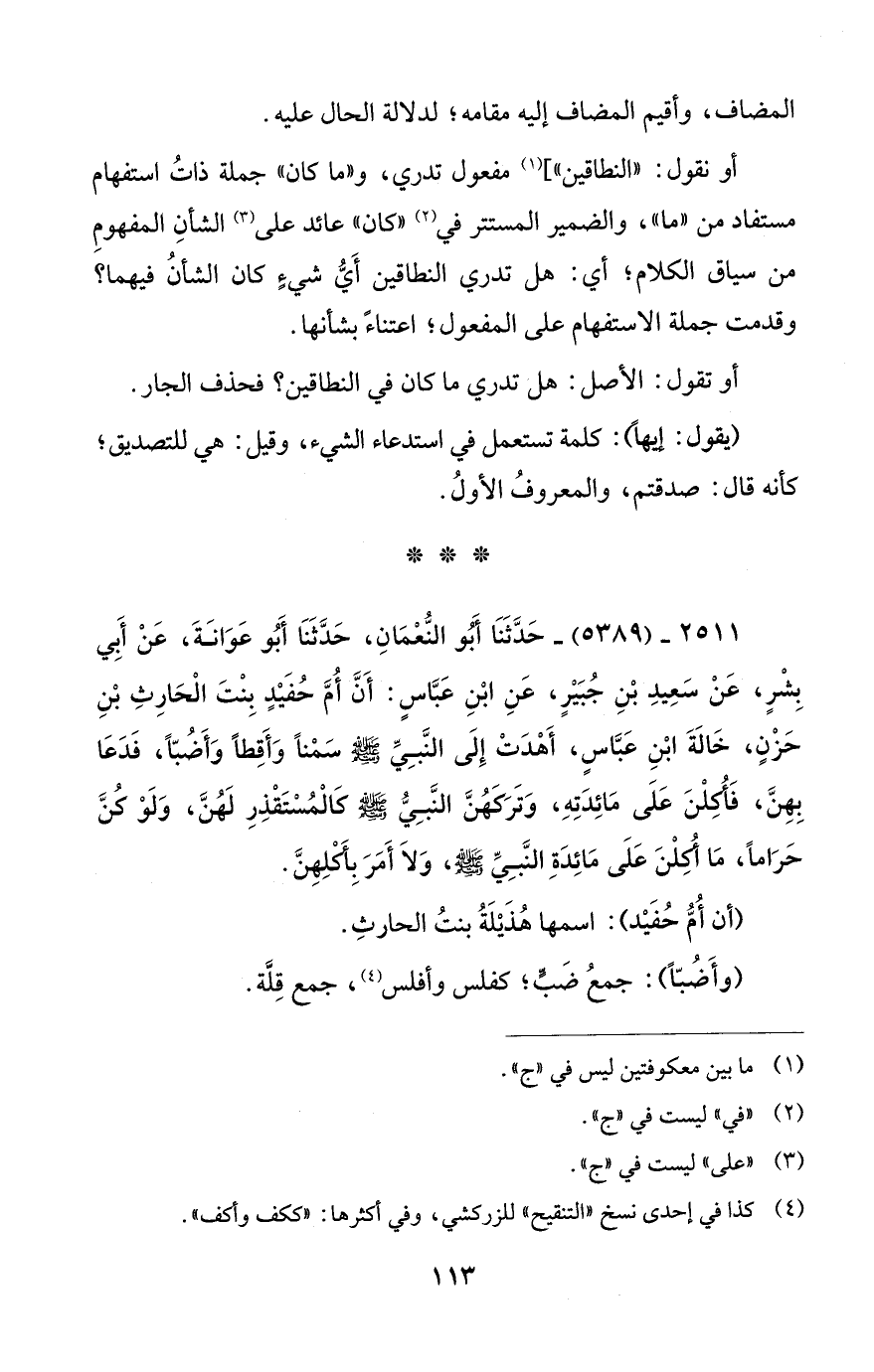2511 - (5389) - حَدَّثَنَا أَبُو النُّعْمَانِ، حَدَّثَنَا أَبُو عَوَانَةَ، عَنْ أَبي بِشْرٍ، عَنْ سَعِيدِ بْنِ جُبَيْرٍ، عَنِ ابْنِ عَبَّاسٍ: أَنَّ أُمَّ حُفَيْدٍ بِنْتَ الْحَارِثِ بْنِ حَزْنٍ، خَالَةَ ابْنِ عَبَّاسٍ، أَهْدَتْ إِلَى النَّبِيِّ - صلى الله عليه وسلم - سَمْنًا وَأَقِطًا وَأَضُبًّا، فَدَعَا بِهِنَّ، فَأُكِلْنَ عَلَى مَائِدَتِهِ، وَتَرَكهُنَّ النَّبِيُّ - صلى الله عليه وسلم - كالْمُسْتَقْذِرِ لَهُنَّ، وَلَوْ كُنَّ حَرَامًا، مَا أُكِلْنَ عَلَى مَائِدَةِ النَّبِيِّ - صلى الله عليه وسلم -، وَلَا أَمَرَ بِأَكْلِهِنَّ.