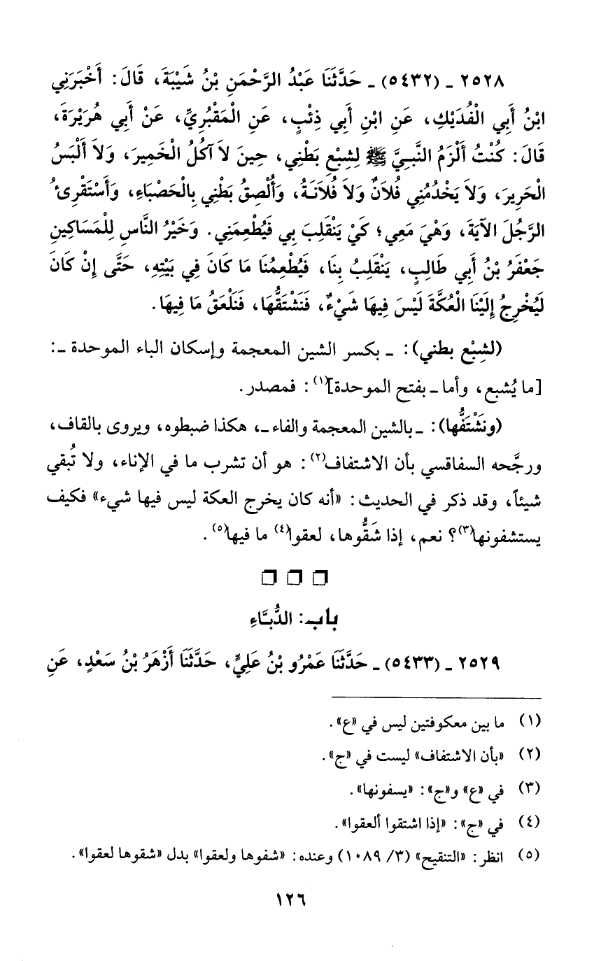 2528 - (5432) - حَدَّثَنَا عَبْدُ الرَّحْمَنِ بْنُ شَيْبَةَ، قَالَ: أَخْبَرَنِي ابْنُ أَبِي الْفُدَيْكِ، عَنِ ابْنِ أَبِي ذِئْبٍ، عَنِ الْمَقْبُرِيِّ، عَنْ أَبِي هُرَيْرَةَ، قَالَ: كُنْتُ أَلْزَمُ النَبِيَّ - صلى الله عليه وسلم - لِشِبْعِ بَطْنِي، حِينَ لَا آكُلُ الْخَمِيرَ، وَلَا أَلْبَسُ الْحَرِيرَ، وَلَا يَخْدُمُنِي فُلَانٌ وَلَا فُلَانَةُ، وَألصِقُ بَطْنِي بِالْحَصْبَاءَ، وَأَسْتَقْرِئُ الرَّجُلَ الآيَةَ، وَهيَ مَعِي؛ كَيْ يَنْقَلِبَ بِي فَيُطْعِمَنِي. وَخَيْرُ النَّاسِ لِلْمَسَاكِينِ جَعْفَرُ بْنُ أَبِي طَالِبٍ، يَنْقَلِبُ بِنَا، فَيُطْعِمُنَا مَا كَانَ فِي بَيْتِهِ، حَتَّى إِنْ كَانَ لَيُخْرِجُ إِلَيْنَا الْعُكَّةَ لَيْسَ فِيهَا شَيْءٌ، فَنَشْتَقُّهَا، فَنَلْعَقُ مَا فِيهَا.