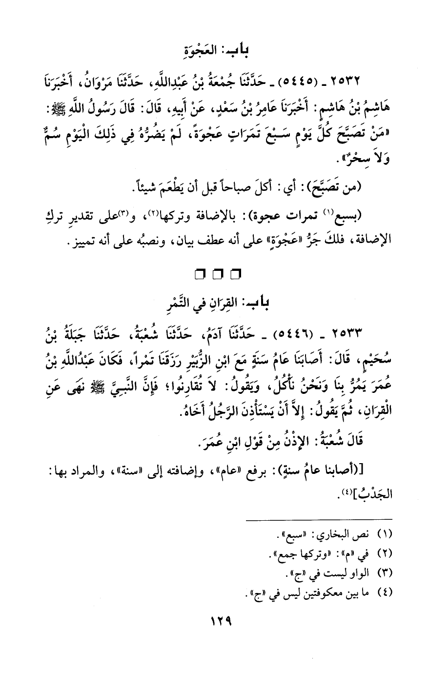 2533 - (5446) - حَدَّثَنَا آدَمُ، حَدَّثَنَا شُعْبَةُ، حَدَّثَنَا جَبَلَةُ بْنُ سُحَيْم، قَالَ: أَصَابَنَا عَامُ سَنَةٍ مَعَ ابْنِ الزُّبَيْرِ رَزَقَنَا تَمْرًا، فَكَانَ عَبْدُ اللَّهِ بْنُ عُمَرَ يَمُرُّ بِنَا وَنَحْنُ نَأْكُلُ، وَيَقُولُ: لَا تُقَارِنوُا؛ فَإِنَّ النَّبِيَّ - صلى الله عليه وسلم - نَهَى عَنِ الْقِرَانِ، ثُمَّ يَقُولُ: إِلَّا أَنْ يَسْتَأْذِنَ الرَّجُلُ أَخَاهُ.