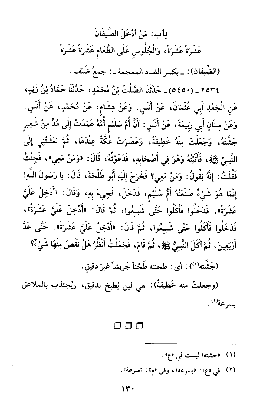 2534 - (5450) - حَدَّثَنَا الصَّلْتُ بْنُ مُحَمَّدٍ، حَدَّثَنَا حَمَّادُ بْنُ زَيْدٍ، عَنِ الْجَعْدِ أَبِي عُثْمَانَ، عَنْ أَنسٍ. وَعَنْ هِشَامٍ، عَنْ مُحَمَّدٍ، عَنْ أَنسٍ. وَعَنْ سِنَانٍ أَبِي رَبِيعَةَ، عَنْ أَنَسٍ: أَنَّ أُمَّ سُلَيْمٍ أُمَّهُ عَمَدَتْ إِلَى مُدٍّ مِنْ شَعِيرٍ جَشَّتْهُ، وَجَعَلَتْ مِنْهُ خَطِيفَةً، وَعَصَرَتْ عُكَّةً عِنْدَهَا، ثُمَّ بَعَثَتْنِي إِلَى النَّبِيِّ - صلى الله عليه وسلم -، فَأَتَيْتُهُ وَهْوَ فِي أَصْحَابِهِ، فَدَعَوْتُهُ، قَالَ: "وَمَنْ مَعِي"، فَجئْتُ فَقُلْتُ: إِنَّهُ يَقُولُ: وَمَنْ مَعِي؟ فَخَرَجَ إِلَيْهِ أَبُو طَلْحَةَ، قَالَ: يا رَسُولَ اللَّهِ! إِنَّمَا هُوَ شَيْء صَنَعَتْهُ أُمُّ سُلَيْمٍ، فَدَخَلَ، فَجيءَ بِهِ، وَقَالَ: "أَدْخِلْ عَلَيَّ عَشَرَةً"، فَدَخَلُوا فَأَكَلُوا حَتَّى شَبِعُوا، ثُمَّ قَالَ: "أَدْخِلْ عَلَيَّ عَشَرَةً"، فَدَخَلُوا فَأَكَلُوا حَتَّى شَبِعُوا، ثُمَّ قَالَ: "أَدْخِلْ عَلَيَّ عَشَرَةً". حَتَّى عَدَّ أَرْبَعِينَ، ثُمَّ أَكَلَ النَّبِيُّ - صلى الله عليه وسلم -، ثُمَّ قَامَ، فَجَعَلْتُ أَنْظُرُ هَلْ نَقَصَ مِنْهَا شَيْءٌ؟