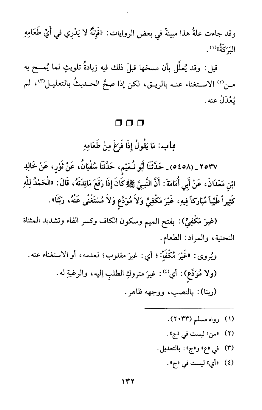 2537 - (5458) - حَدَّثَنَا أَبُو نُعَيْمٍ، حَدَّثَنَا سُفْيَانُ، عَنْ ثَوْرٍ، عَنْ خَالِدِ ابْنِ مَعْدَانَ، عَنْ أَبِي أُمَامَةَ: أَنَّ النَّبِي - صلى الله عليه وسلم - كَانَ إِذَا رَفَعَ مَائِدَتَهُ، قَالَ: "الْحَمْدُ لِلَّهِ كَثِيرًا طَيِّبًا مُبَارَكًا فِيهِ، غَيْرَ مَكْفِيٍّ وَلَا مُوَدَّعٍ وَلَا مُسْتَغْنًى عَنْهُ، رَبَّنَا".