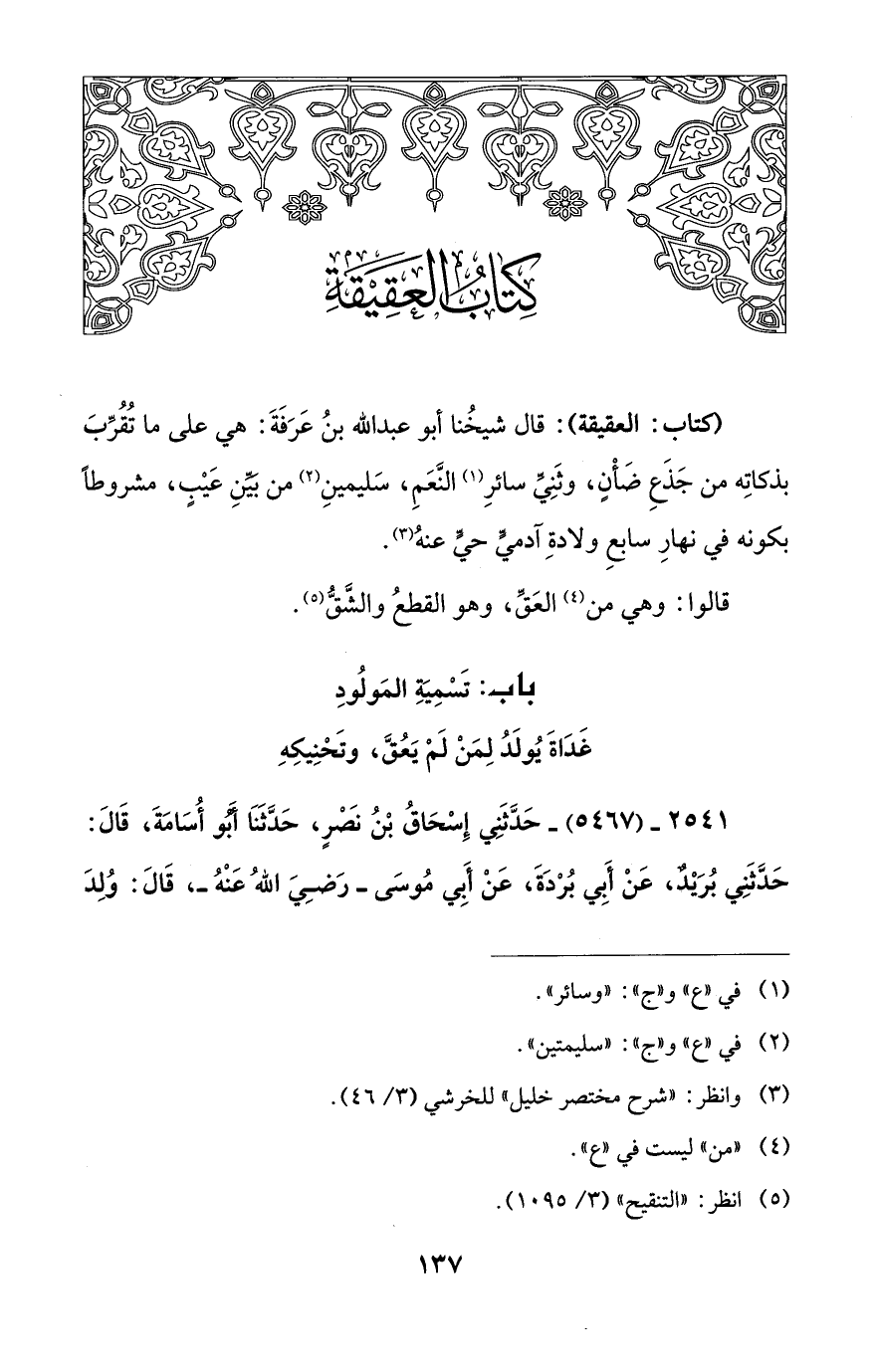 (كتاب: العقيقة): قال شيخُنا أبو عبد الله بنُ عَرَفَةَ: هي على ما تُقُرِّبَ بذكاتِه من جَذَعِ ضَأْنٍ، وثَنِيِّ سائرِ (¬1) النَّعَمِ، سَليمينِ (¬2) من بينِ عَيْبٍ، مشروطاً بكونه في نهارِ سابعِ ولادةِ آدميًّ حيًّ عنهُ (¬3).
