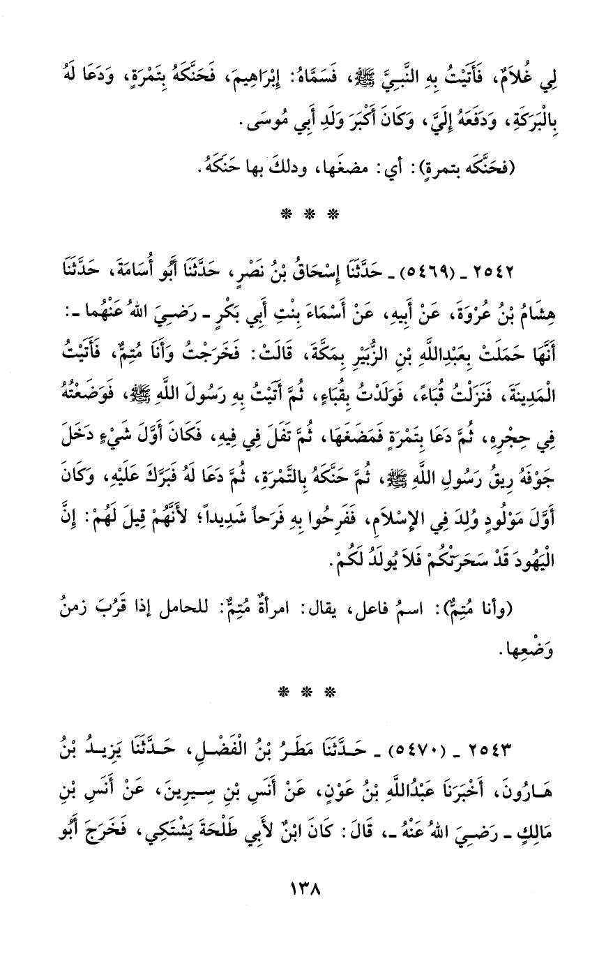 2542 - (5469) - حَدَّثَنَا إِسْحَاقُ بْنُ نَصْرٍ، حَدَّثَنَا أبو أُسَامَةَ، حَدَّثَنَا هِشَامُ بْنُ عُروَةَ، عَنْ أَبِيهِ، عَنْ أَسْمَاءَ بِنْتِ أَبِي بَكْرٍ - رَضِيَ اللهُ عَنْهُما -: أَنها حَمَلَتْ بِعَبْدِ اللَّهِ بْنِ الزُّبَيْرِ بِمَكَّةَ، قَالَتْ: فَخَرَجْتُ وَأَناَ مُتِمٌّ، فَأَتَيْتُ الْمَدِينَةَ، فَنَزَلْتُ قُبَاءً، فَوَلَدْتُ بِقُبَاءٍ، ثُمَّ أَتَيْتُ بِهِ رَسُولَ اللَّهِ - صلى الله عليه وسلم -، فَوَضَعْتُهُ فِي حِجْرِهِ، ثُمَّ دَعَا بِتَمرَةٍ فَمَضَغَها، ثُمَّ تَفَلَ فِي فِيهِ، فَكَانَ أَوَّلَ شَيْءً دَخَلَ جَوْفَهُ رِيقُ رَسُولِ اللَّهِ - صلى الله عليه وسلم -، ثُمَّ حَنَّكَهُ بِالتَّمْرَةِ، ثُمَّ دَعَا لَهُ فَبَرَّكَ عَلَيْهِ، وَكَانَ أَوَّلَ مَوْلُودٍ وُلِدَ فِي الإِسْلاَمِ، فَفَرِحُوا بِهِ فَرَحاً شَدِيداً؛ لأَنَّهُمْ قِيلَ لَهُمْ: إِنَّ الْيَهُودَ قَدْ سَحَرَتْكُمْ فَلاَ يُولَدُ لَكُمْ.