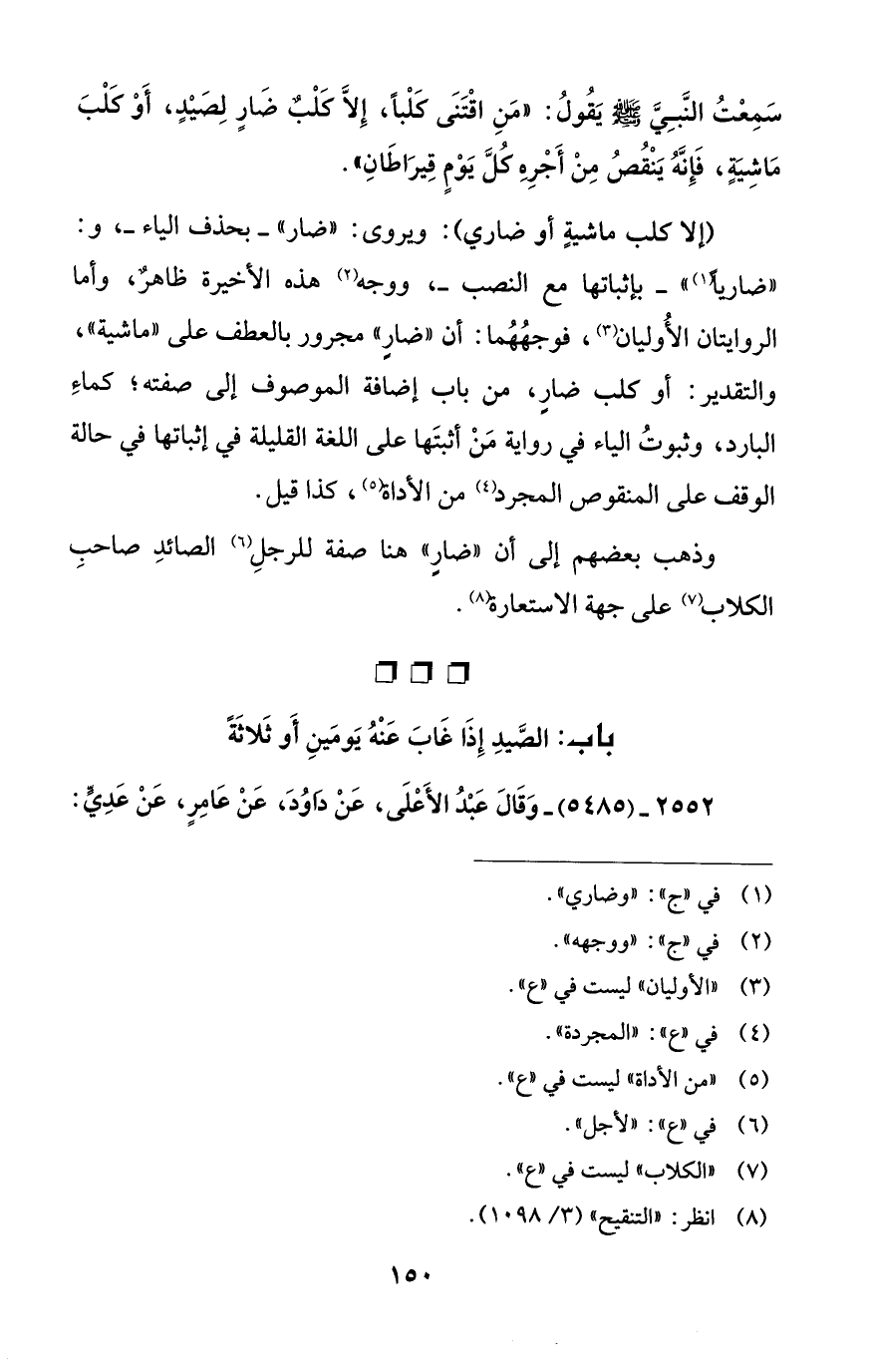 (إلا كلب ماشيةٍ أو ضاري): ويروى: "ضار" - بحذف الياء -، و: "ضارياً (¬1) " - بإثباتها مع النصب -، ووجه (¬2) هذه الأخيرة ظاهرٌ، وأما الروايتان الأُوليان (¬3)، فوجهُهُما: أن "ضارٍ" مجرور بالعطف على "ماشية"، والتقدير: أو كلب ضارٍ، من باب إضافة الموصوف إلى صفته؛ كماءِ البارد، وثبوتُ الياء في رواية مَنْ أثبتَها على اللغة القليلة في إثباتها في حالة الوقف على المنقوص المجرد (¬4) من الأداة (¬5)، كذا قيل.