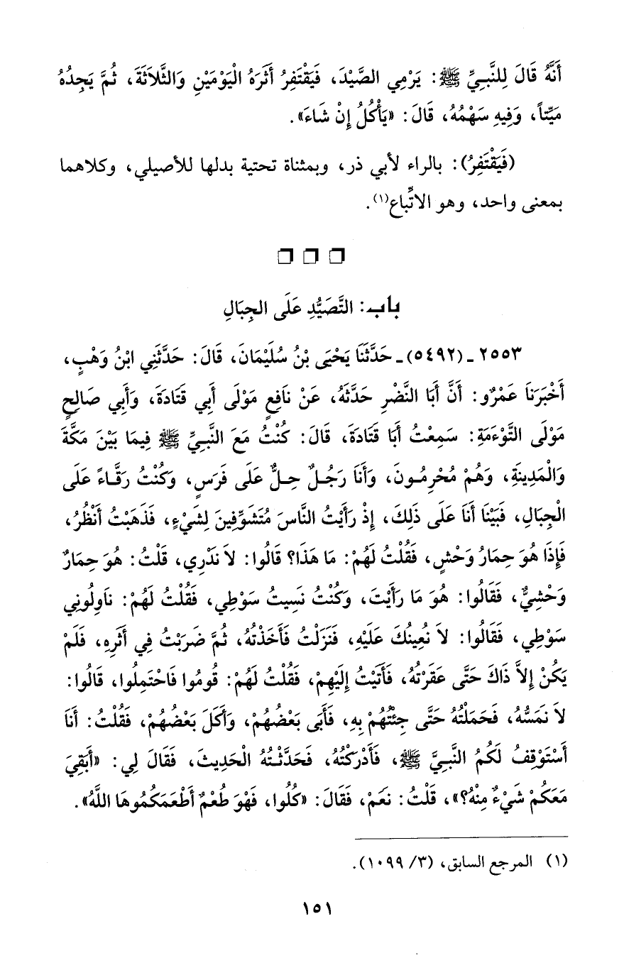 2553 - (5492) - حَدَّثَنَا يَحْيَى بْنُ سُلَيْمَانَ، قَالَ: حَدَّثَنِي ابْنُ وَهْبٍ، أَخْبَرَنَا عَمْرٌو: أَنَّ أَبَا النَّضْرِ حَدَّثَهُ، عَنْ ناَفِعٍ مَوْلَى أَبي قتادَةَ، وَأَبي صَالِحٍ مَوْلَى التَّوْءَمَةِ: سَمِعْتُ أَبَا قتادَةَ، قَالَ: كُنْتُ مَعَ النَّبِيِّ - صلى الله عليه وسلم - فِيمَا بَيْنَ مَكَّةَ وَالْمَدِينَةِ، وَهُمْ مُخرِمُونَ، وَأَناَ رَجُلٌ حِلٌّ عَلَى فَرَسٍ، وَكنْتُ رَقَّاءً عَلَى الْجبَالِ، فَبَيْنَا أَنَا عَلَى ذَلِكَ، إِذْ رَأَيْتُ النَّاسَ مُتَشَوّفينَ لِشَيْءٍ، فَذَهبْتُ أَنْظُرُ، فَإِذَا هُوَ حِمَارُ وحْشٍ، فَقُلْتُ لَهُم: مَا هَذَا؟ قَالُوا: لاَ نَدْرِي، قَلْتُ: هُوَ حِمَارٌ وَحْشِيٌّ، فَقَالُوا: هُوَ مَا رَأَيْتَ، وَكُنْتُ نَسِيتُ سَوْطِي، فَقُلْتُ لَهُمْ: نَاوِلُونِي سَوْطِي، فَقَالُوا: لاَ نُعِينُكَ عَلَيْهِ، فَنَزَلْتُ فأَخَذْتُهُ، ثُمَّ ضَرَبْتُ فِي أَثَرِهِ، فَلَمْ يَكُنْ إِلاَّ ذَاكَ حَتَى عَقَرْتُهُ، فَأَتَيْتُ إِلَيْهِمْ، فَقُلْتُ لَهُمْ: قُومُوا فَاحْتَمِلُوا، قَالُوا: لاَ نَمَسُّهُ، فَحَمَلْتُهُ حَتَّى جِئْتُهُمْ بِهِ، فَأَبَى بَعضُهُمْ، وَأَكَلَ بَعْضُهُمْ، فَقُلْتُ: أَنَا أَسْتَوْقِفُ لَكُمُ النَّبِيَّ - صلى الله عليه وسلم -، فَأَدْرَكْتُهُ، فَحَدَّثْتُهُ الْحَدِيثَ، فَقَالَ لِي: "أَبَقِيَ مَعَكُمْ شَيْءٌ مِنْهُ؟ "، قَلْتُ: نَعَمْ، فَقَالَ: "كُلُوا، فَهْوَ طُعْمٌ أَطْعَمَكُمُوهَا اللَّهُ".