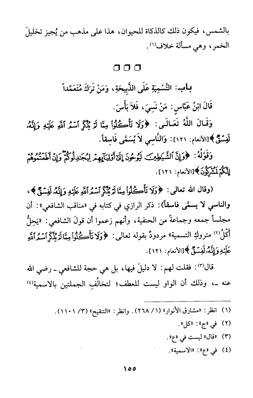(وقال الله تعالى: {ولَا تَأْكُلُوا مِمَّا لَمْ يُذْكَرِ اسْمُ اللَّهِ عَلَيْهِ وَإِنَّهُ لَفِسْقٌ}، والناسي لا يسمَّى فاسقاً): ذكر الرازي في كتابه في "مناقب الشافعي": أن مجلساً جمعه وجماعةً من الحنفية، وأنهم زعموا أن قولَ الشافعي: "يَحِلُّ أَكْلُ (¬2) متروكِ التسمية" مردودٌ بقوله تعالى: {وَلَا تَأْكُلُوا مِمَّا لَمْ يُذْكَرِ اسْمُ اللَّهِ عَلَيْهِ وَإِنَّهُ لَفِسْقٌ} [الأنعام: 121].