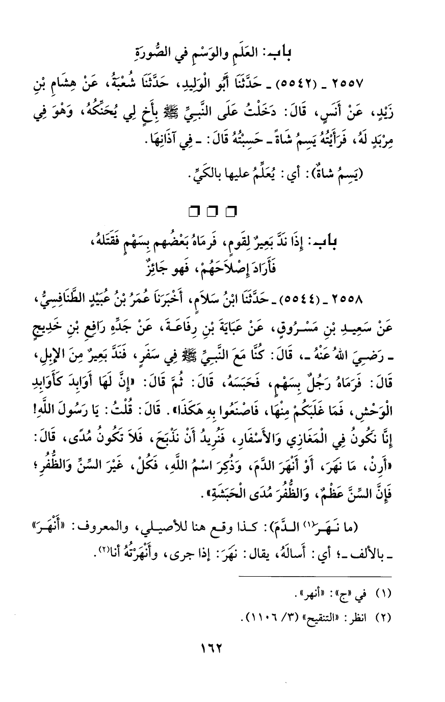 2558 - (5544) - حَدَّثَنَا ابْنُ سَلاَمٍ، أَخْبَرَنَا عُمَرُ بْنُ عُبَيْدٍ الطَّنَافِسِيُّ، عَنْ سَعِيدِ بْنِ مَسْرُوقٍ، عَنْ عَبَايَةَ بْنِ رِفَاعَةَ، عَنْ جَدِّهِ رَافِعِ بْنِ خَدِيجٍ - رَضِيَ اللَّهُ عَنْهُ -، قَالَ: كُنَّا مَعَ النَّبِيِّ - صلى الله عليه وسلم - فِي سَفَرٍ، فَنَدَّ بَعِيرٌ مِنَ الإِبِلِ، قَالَ: فَرَمَاهُ رَجُلٌ بِسَهْمٍ، فَحَبَسَهُ، قَالَ: ثُمَّ قَالَ: "إِنَّ لَها أَوَابِدَ كَأَوَابِدِ الْوَحْشِ، فَمَا غَلَبَكُمْ مِنْهَا، فَاصْنَعُوا بِهِ هكَذَا". قَالَ: قُلْتُ: يَا رَسُولَ اللَّهِ! إِنَّا نَكُونُ فِي الْمَغَازِي وَالأَسْفَارِ، فَنُرِيدُ أَنْ نَذْبَحَ، فَلاَ تَكُونُ مُدًى، قَالَ: "أَرِنْ، مَا نَهَرَ، أَوْ أَنْهَرَ الدَّمَ، وَذُكِرَ اسْمُ اللَّهِ، فَكُلْ، غَيْرَ السَّنِّ وَالظُّفُرِ؛ فَإِنَّ السِّنَّ عَظْمٌ، وَالظُّفُرَ مُدَى الْحَبَشَةِ".