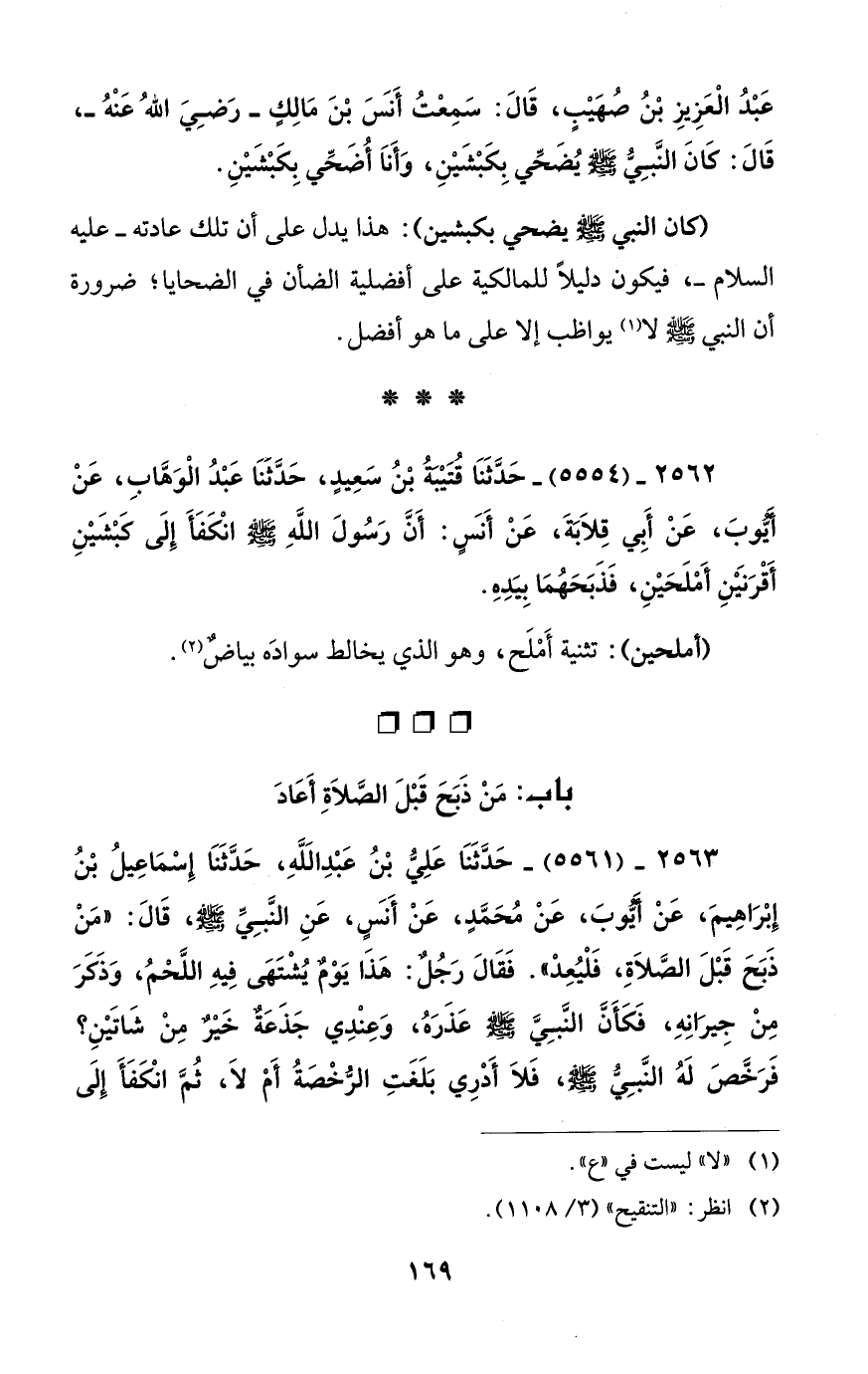 عَبْدُ الْعَزِيزِ بْنُ صُهيْبٍ، قَالَ: سَمِعْتُ أَنَسَ بْنَ مَالِكٍ - رَضِيَ اللهُ عَنْهُ -، قَالَ: كَانَ النَّبِيُّ - صلى الله عليه وسلم - يُضَحِّي بِكَبْشَيْنِ، وَأَناَ أُضَحِّي بِكَبْشَيْنِ.