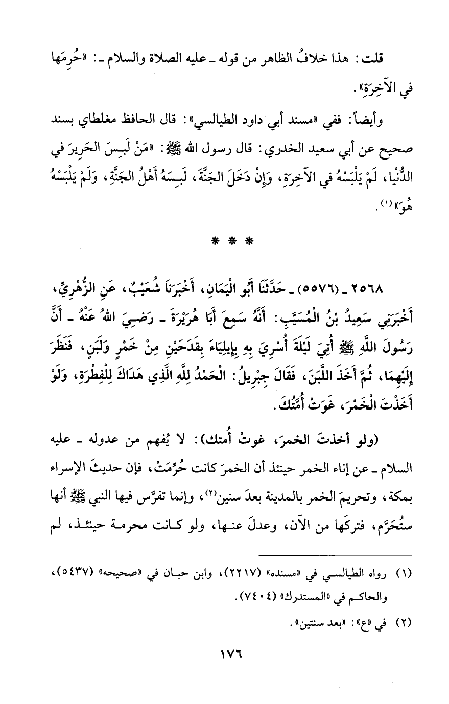 وأيضاً: ففي "مسند أبي داود الطيالسي": قال الحافظ مغلطاي بسند صحيح عن أبي سعيد الخدري: قال رسول الله - صلى الله عليه وسلم -: "مَنْ لَبِسَ الحَرِيرَ في الدُّنْيا، لَمْ يَلْبَسْهُ في الآخِرَةِ، وَإِنْ دَخَلَ الجَنَّةَ، لَبِسَهُ أَهْلُ الجَنَّةِ، وَلم يَلْبَسْهُ هُوَ" (¬1).