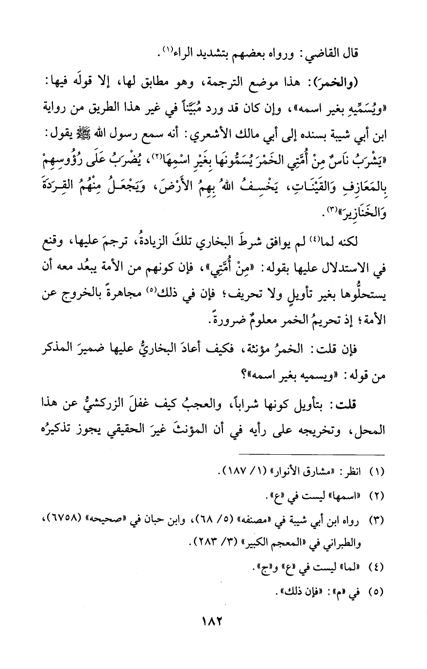 (والخمرَ): هذا موضع الترجمة، وهو مطابق لها، إلا قولَه فيها: "ويُسَمِّيهِ بغير اسمه"، وإن كان قد ورد مُبَيَّناً في غير هذا الطريق من رواية ابن أبي شيبة بسنده إلى أبي مالك الأشعري: أنه سمع رسول الله - صلى الله عليه وسلم - يقول: "يَشْرَبُ نَاسٌ مِنْ أُمَّتِي الخَمْرَ يُسَمُّونَها بِغَيْرِ اسْمِهَا (¬2)، يُضْرَبُ عَلَى رُؤُوسِهِمْ بِالمَعَازِفِ وَالقَيْنَاتِ، يَخْسِفُ اللهُ بِهِمُ الأَرْضَ، وَيَجْعَلُ مِنْهُمُ القِرَدَةَ وَالخَنَازِيرَ" (¬3).