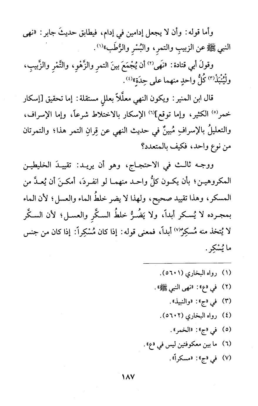 قال ابن المنير: ويكون النهي معلَّلاً بعللٍ مستقلة: إما تحقيق [إسكار خمر (¬5) الكثير، وإما توقع] (¬6) الإسكار بالاختلاط شرعاً، وإما الإسراف، والتعليلُ بالإسرافِ مُبينٌ في حديث النهي عن قِرانِ التمر هذا؛ والتمرتان من نوع واحد، فكيف بالمتعدد؟