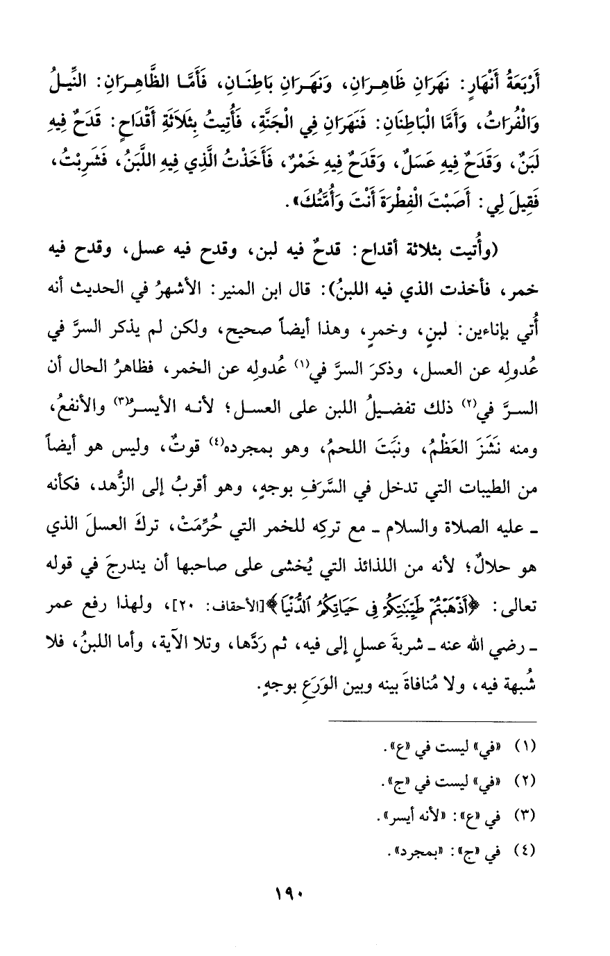 أرْبَعَةُ أَنْهَارٍ: نَهَرَانِ ظَاهِرَانِ، وَنَهَرَانِ بَاطِنَانِ، فَأَمَّا الظَّاهِرَانِ: النِّيلُ وَالْفُراتُ، وَأَمَّا البَاطِنَانِ: فَنَهَرَانِ فِي الْجَنَّةِ، فَأُتِيتُ بِثَلاَثَةِ أَقْدَاحٍ: قَدَحٌ فِيهِ لَبَنٌ، وَقَدحٌ فِيهِ عَسَلٌ، وَقَدَحٌ فِيهِ خَمْرٌ، فَأَخَذْتُ الَّذِي فِيهِ اللَّبَنُ، فَشَرِبْتُ، فَقِيلَ لِي: أَصَبْتَ الْفِطْرَةَ أَنْتَ وَأُمَّتُكَ".