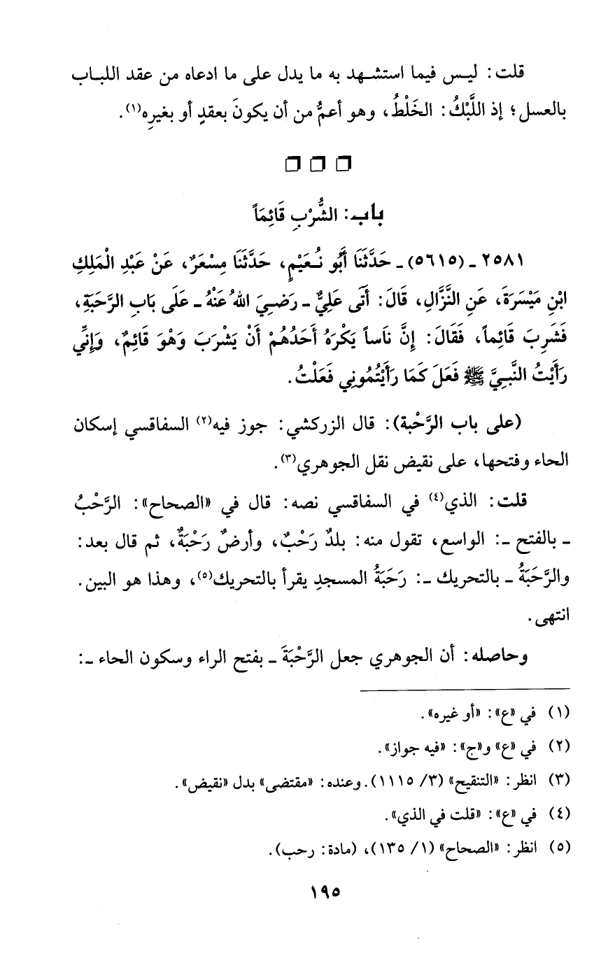 2581 - (5615) - حَدَّثَنَا أبَو نُعَيْمٍ، حَدَّثَنَا مِسْعَرٌ، عَنْ عَبْدِ الْمَلِكِ ابْنِ مَيْسَرَةَ، عَنِ النَّزَّالِ، قَالَ: أَتَى عَلِيٌّ - رَضِيَ اللهُ عَنْهُ - عَلَى بَابِ الرَّحَبَةِ، فَشَرِبَ قَائِماً، فَقَالَ: إِنَّ نَاساً يَكْرَهُ أَحَدُهُمْ أَنْ يَشْرَبَ وَهْوَ قَائِمٌ، وَإِنَّي رَأَيْتُ النَّبِيَّ - صلى الله عليه وسلم - فَعَلَ كَمَا رَأَيْتُمُونِي فَعَلْتُ.