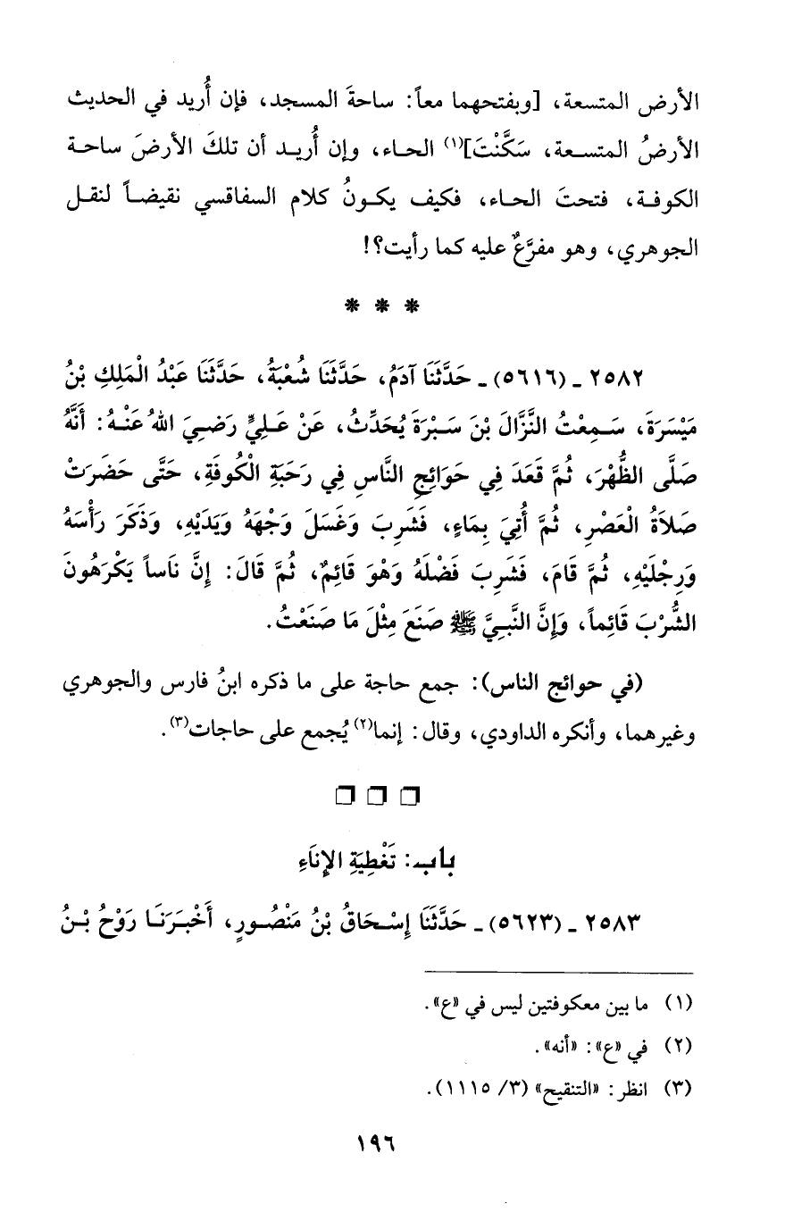2582 - (5616) - حَدَّثَنَا آدَمُ، حَدَّثَنَا شُعْبَةُ، حَدَّثَنَا عَبْدُ الْمَلِكِ بْنُ مَيْسَرَةَ، سَمِعْتُ النَّزَّالَ بْنَ سَبْرَةَ يُحَدِّثُ، عَنْ عَلِيًّ رَضِيَ اللهُ عَنْهُ: أَنَّهُ صَلَّى الظُّهْرَ، ثُمَّ قَعَدَ فِي حَوَائِجِ النَّاسِ فِي رَحَبَةِ الْكُوفَةِ، حَتَّى حَضَرَتْ صَلاَةُ الْعَصْرِ، ثُمَّ أُتِيَ بِمَاءٍ، فَشَرِبَ وَغَسَلَ وَجْههُ وَيَدَيْهِ، وَذَكَرَ رَأْسَهُ وَرِجْلَيْهِ، ثُمَّ قَامَ، فَشَرِبَ فَضْلَهُ وَهْوَ قَائِمٌ، ثُمَّ قَالَ: إِنَّ ناَساً يَكْرَهُونَ الشُّرْبَ قَائِماً، وَإِنَّ النَّبِيَّ - صلى الله عليه وسلم - صَنَعَ مِثْلَ مَا صَنَعْتُ.